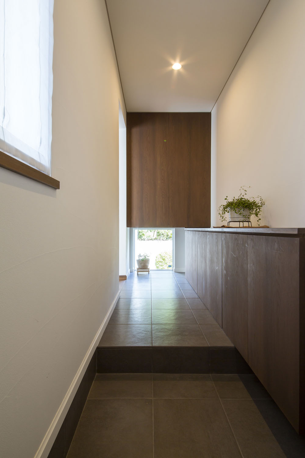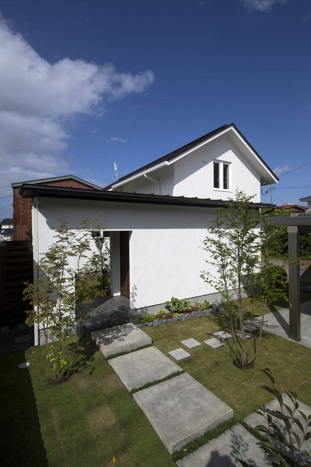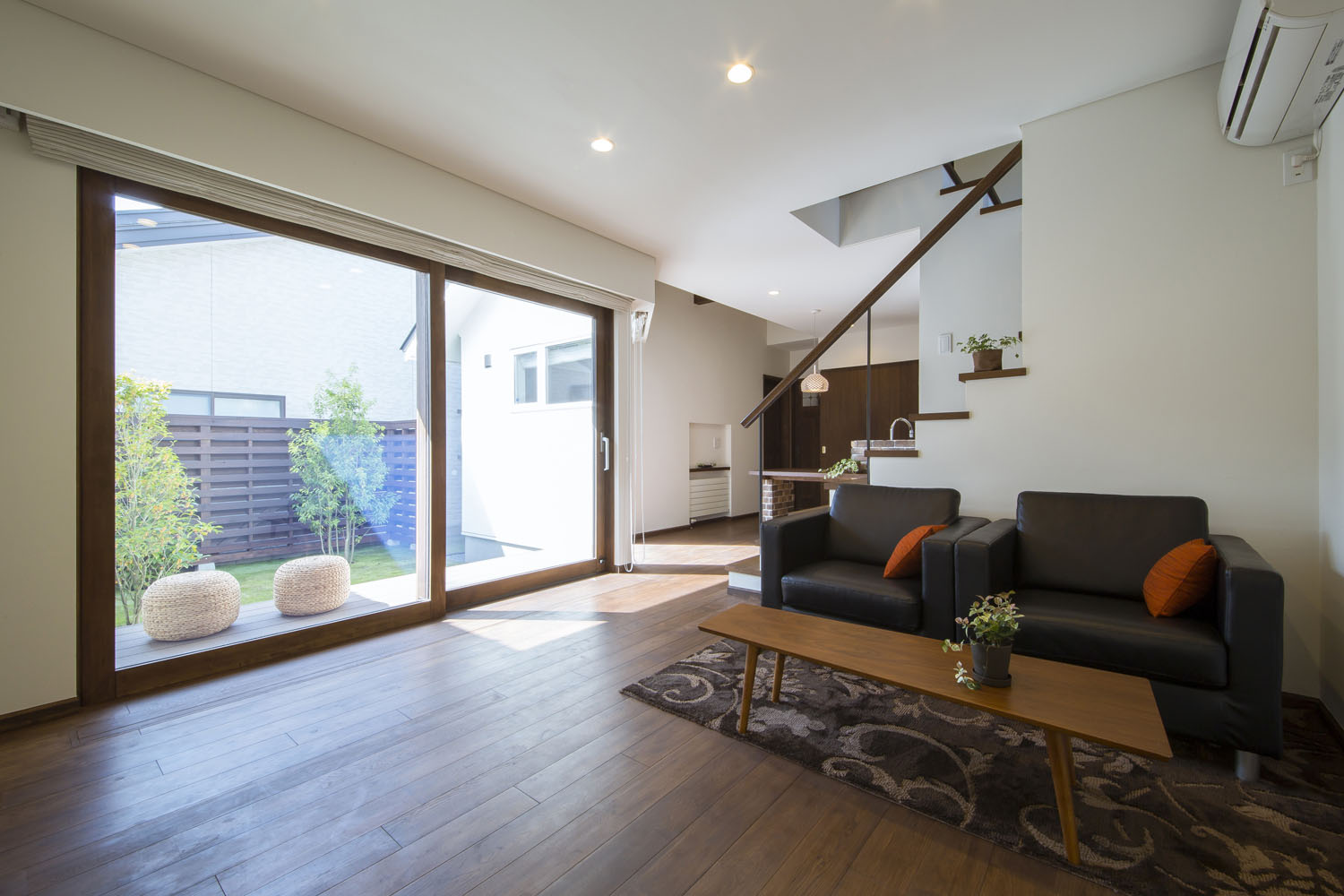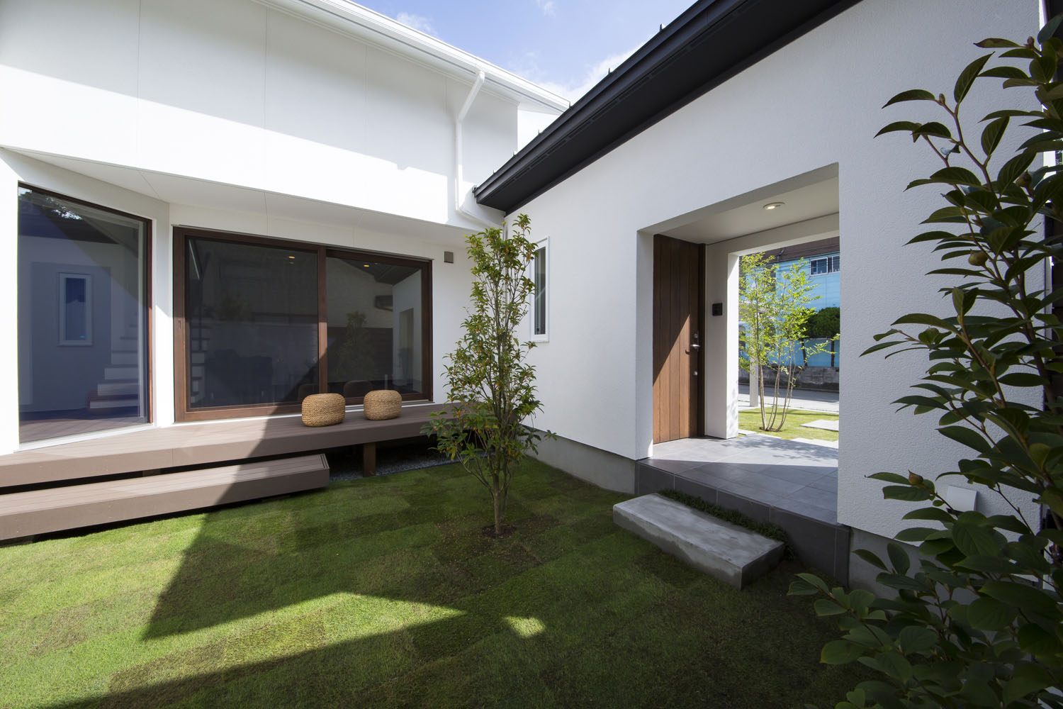 「草木が風に揺れる様子を部屋からぼんやりと眺める。誰にも気兼ねなく、ゆったりと時間を過ごせる自分たちだけの空間があったなら」。住まいを新築する動機にそんな願いがあったと話す施主のIさん。求める癒やしの空間を叶えてくれそうな施工会社という予感をそのままに、夫妻の望み通りの住まいが完成した。住宅地の一角にゆったりと取られた駐車場とアプローチ。その先に門のように構えるエントランス部分が、中庭と住空間を庇うようにして佇んでいる。ドアを開けると、ゆったりとした奥行きと面の色使いで空間を効果的に見せる玄関ホール。正面の地窓からは坪庭の緑がのぞき、風にゆらめいて訪れた人を出迎える。室内は無垢材の床や左官仕上げの塗りの壁など、自然素材をふんだんに用いた「茶×白」の清楚な印象のインテリア。LDKの広い窓面には、中庭の木々の緑が大きく写し出されている。リビングに身を置くと、窓側と壁側の明るさの対比に感じる得も言われぬ心地良さ。そこには夫妻が住まいに望んだ静謐な時間が流れていた。
