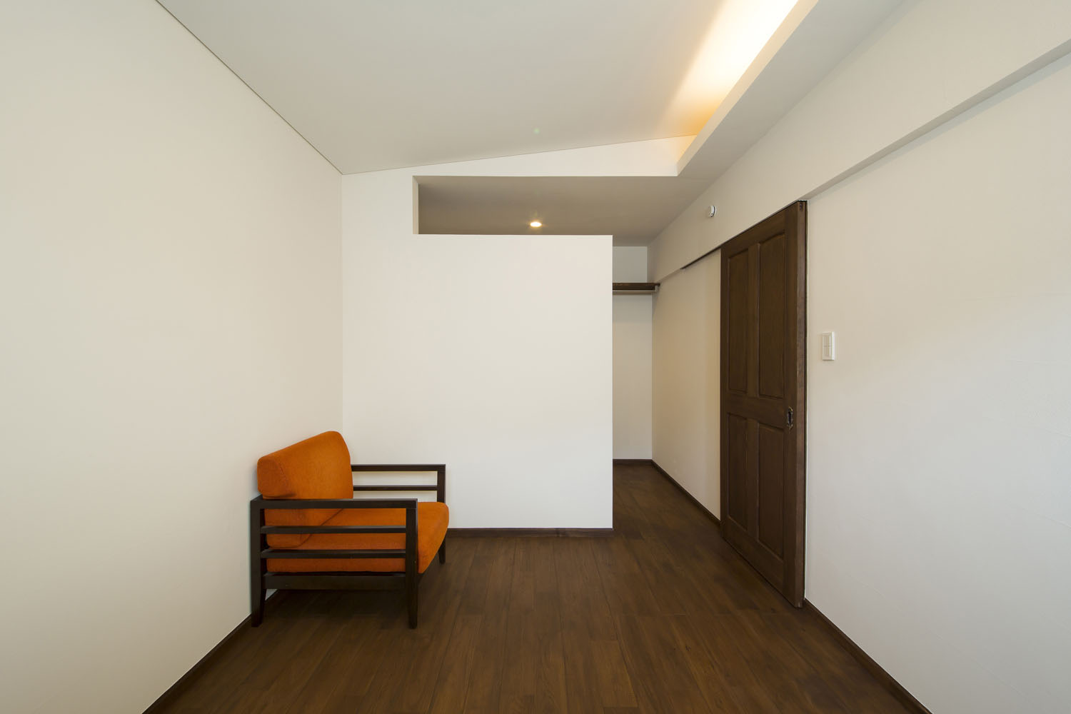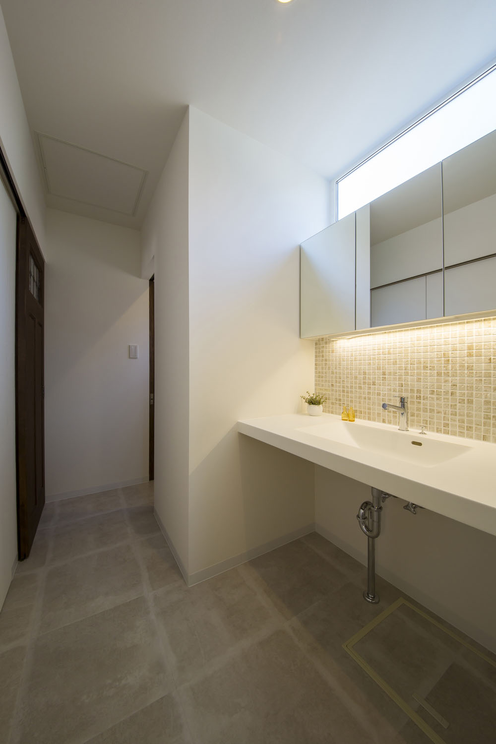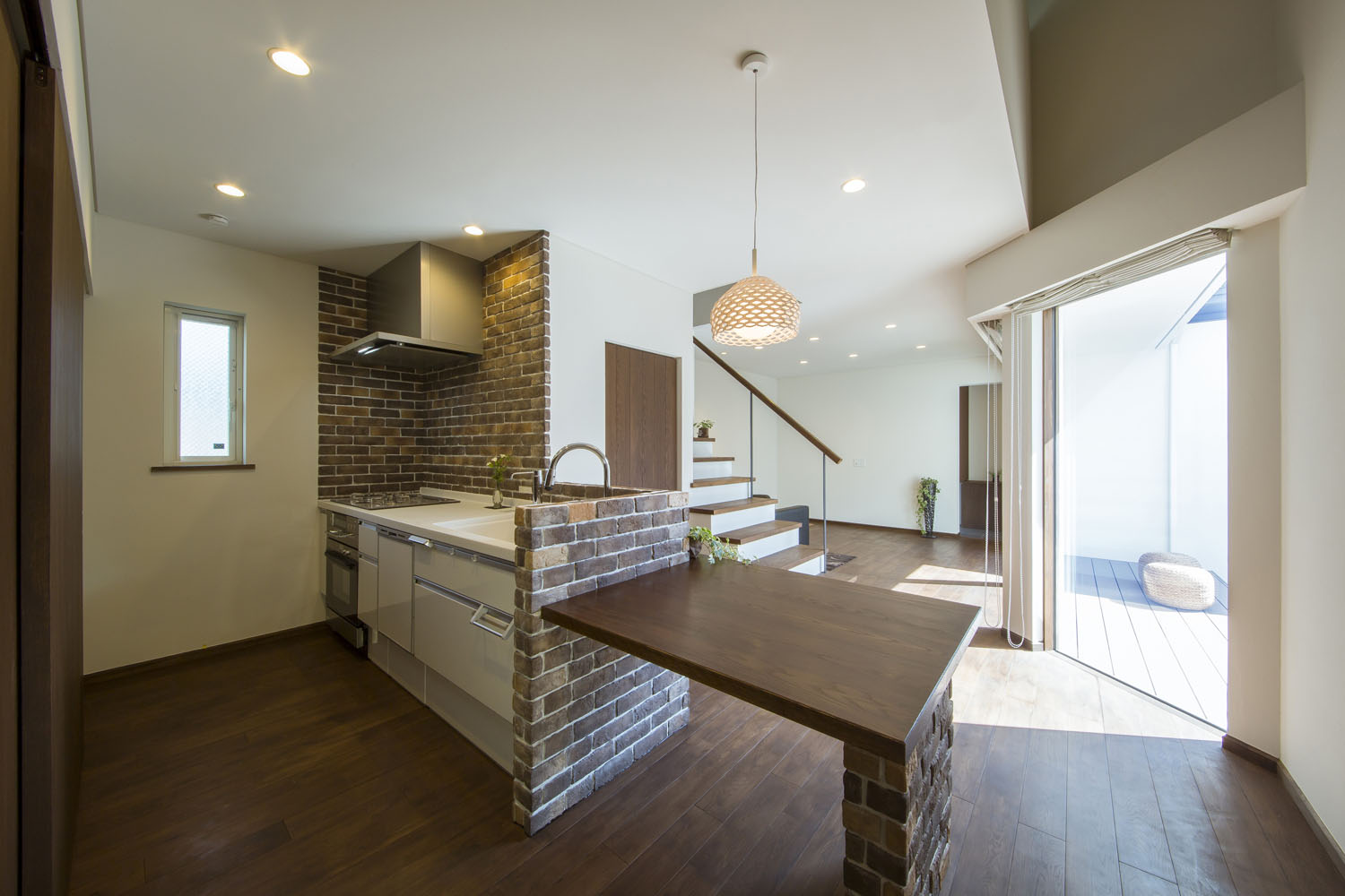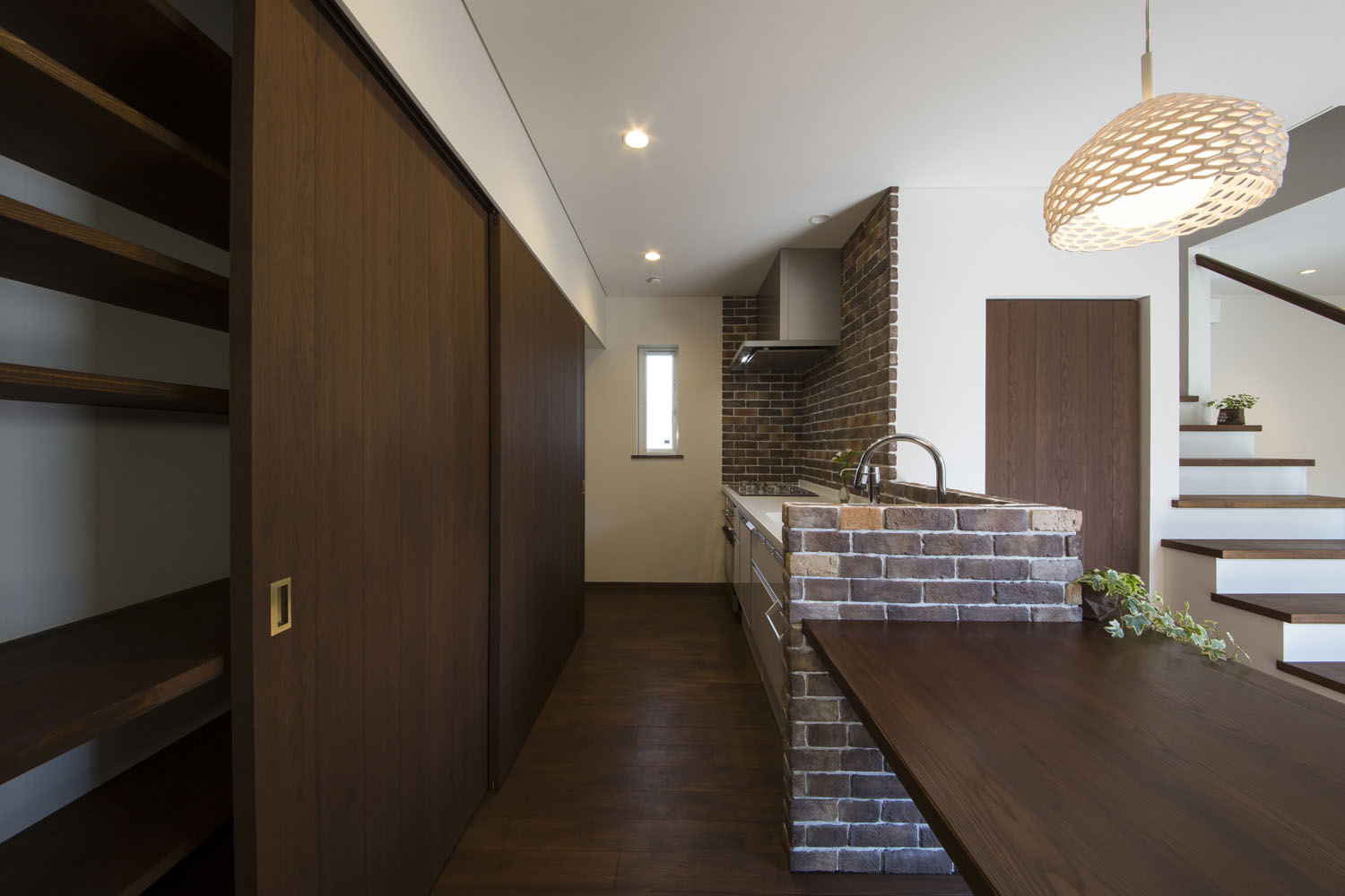 「草木が風に揺れる様子を部屋からぼんやりと眺める。誰にも気兼ねなく、ゆったりと時間を過ごせる自分たちだけの空間があったなら」。住まいを新築する動機にそんな願いがあったと話す施主のIさん。求める癒やしの空間を叶えてくれそうな施工会社という予感をそのままに、夫妻の望み通りの住まいが完成した。住宅地の一角にゆったりと取られた駐車場とアプローチ。その先に門のように構えるエントランス部分が、中庭と住空間を庇うようにして佇んでいる。ドアを開けると、ゆったりとした奥行きと面の色使いで空間を効果的に見せる玄関ホール。正面の地窓からは坪庭の緑がのぞき、風にゆらめいて訪れた人を出迎える。室内は無垢材の床や左官仕上げの塗りの壁など、自然素材をふんだんに用いた「茶×白」の清楚な印象のインテリア。LDKの広い窓面には、中庭の木々の緑が大きく写し出されている。リビングに身を置くと、窓側と壁側の明るさの対比に感じる得も言われぬ心地良さ。そこには夫妻が住まいに望んだ静謐な時間が流れていた。