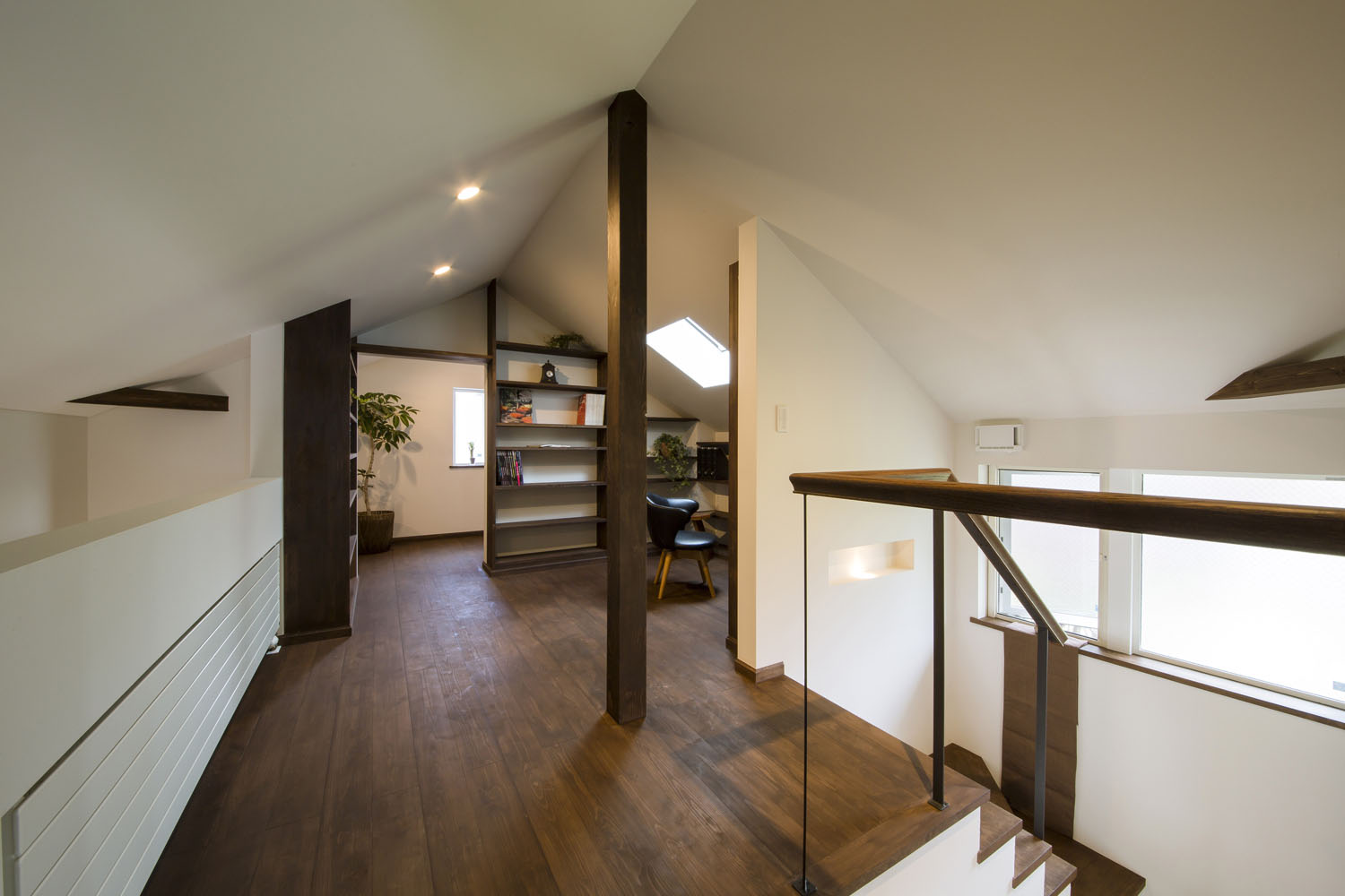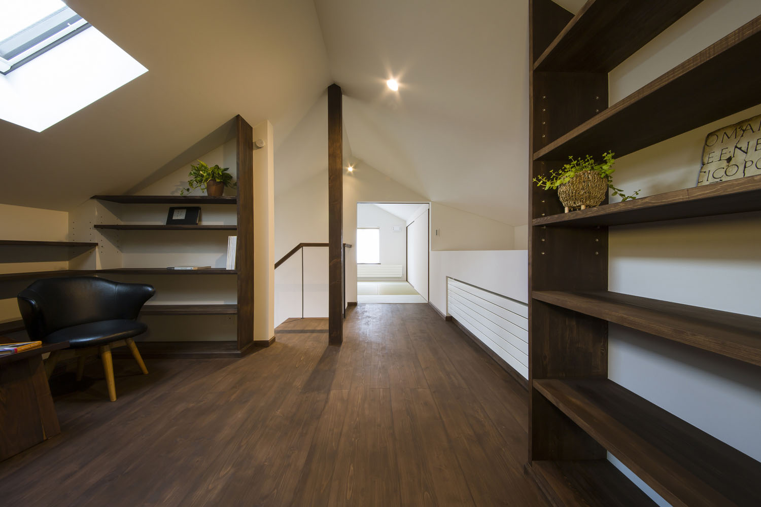 癒やしの空間には、不便を感じない機能性も欠かせない要素だ。この住まいは将来の暮らしやすさを考慮して「居・食・浴・寝」を1階部分に配置し、コンパクトな動線を実現しており、これが忙しい夫妻の今の生活にも役立っている。書架を設けた屋根裏風ギャラリーや、ひとつは欲しいと思っていた和室など、日々の優先性が低い部分は2階へ。「当初は平屋を希望していましたが、クランドさんの提案で一部を2階建てにしました。コストバランスや暮らしの楽しみ方が広がったという点でも正解でした」とIさん。リビング階段と吹き抜けで上下のフロアはオープンにつながっているが、I邸は高性能グラスウールによるダブル断熱仕様で、冬は熱を外に逃がさず、夏は外からの熱の侵入を防ぐため、室内の温度差はほとんど感じず、冷暖房費も低く抑えられる。同社の目指す「本物の格を感じさせる住まいづくり」は、こうした機能のハード面の上に、心地良く暮らすための空間デザインというソフト面が加わって形になっている。