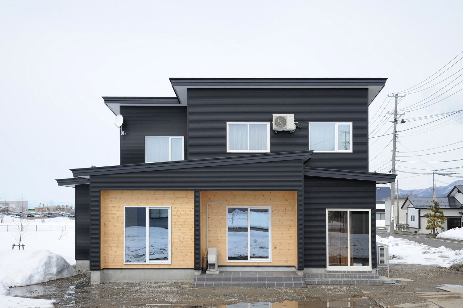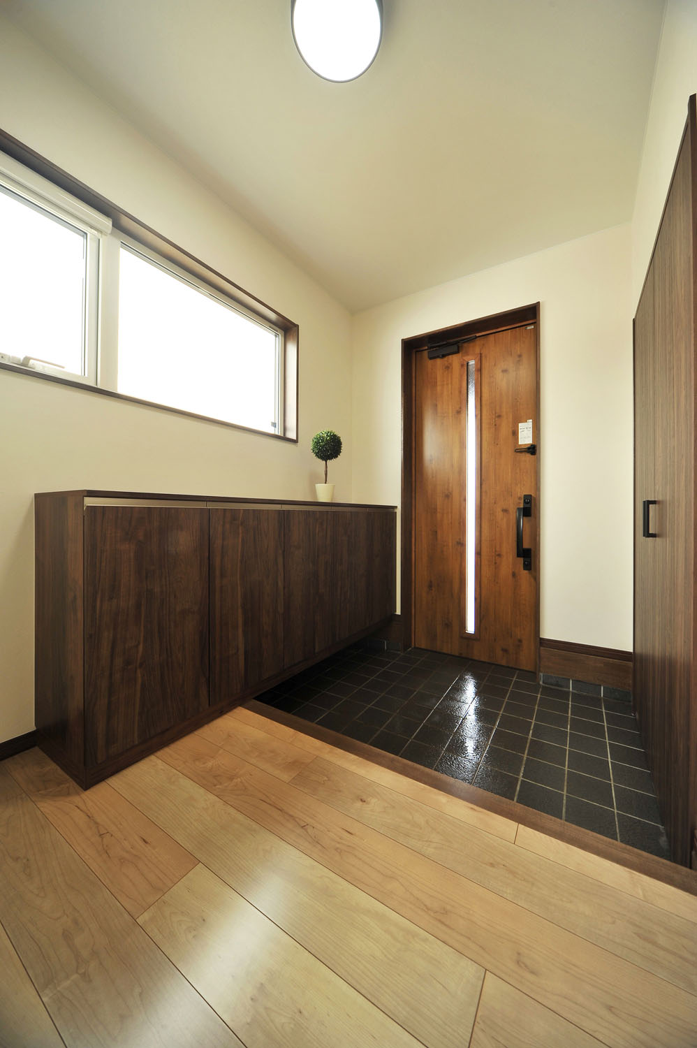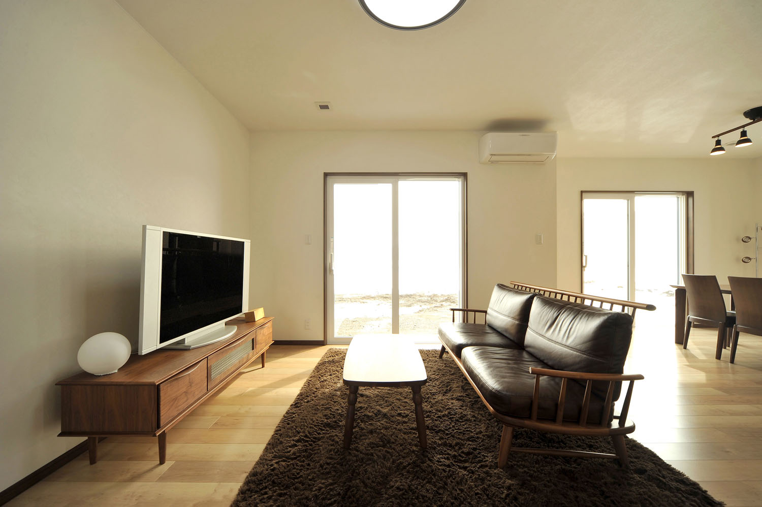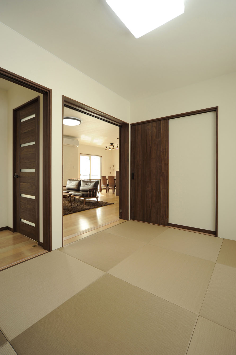 三浦建築設計が手がける住まいは、雪深い県南地域で冬の暖かさに定評がある。住宅性能に関心があった施主のSさんは、自社大工が手がける木工事や実績のある断熱施工に共感を覚え、同社に新築工事を依頼した。プランニングではLDKに続くテラスがあることが第一の要望。バーベキューや子どもたちと花火を楽しむテラスや家族みんなの共有空間であるLDKを広く取り、同時に上下階のすべての部屋に明るさが届くよう窓も多く取られている。LDKとフラットに続いたモダンな和室まわりは、特に客間としての使いやすさを優先した設計。まずは直接出入りができるよう、玄関正面に配置した。そして和室から洗面・トイレ・浴室へと一直線に廊下でつないでいる。これは県外出身の奥さんのご両親に気兼ねなく滞在してもらうための動線。LDKを通らずに出入りでき、娘の嫁ぎ先でも自分たちのペースで過ごしてもらうための配慮だ。玄関を入ってすぐの位置にあっても、Sさんも納得の住宅性能で寒さとは無縁だ。