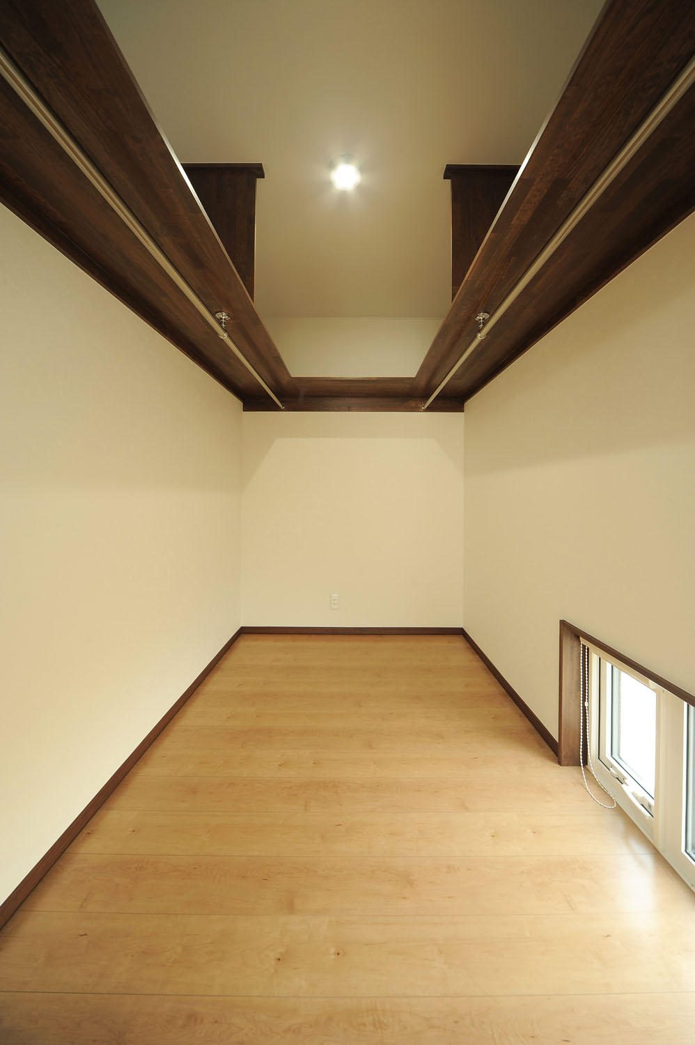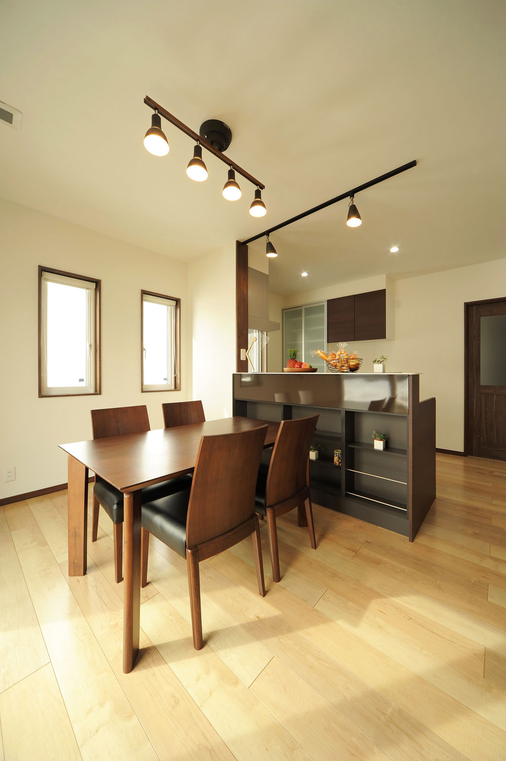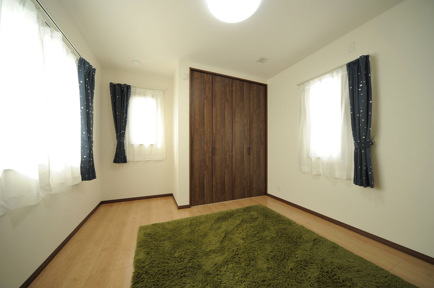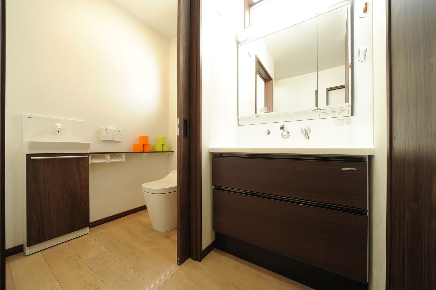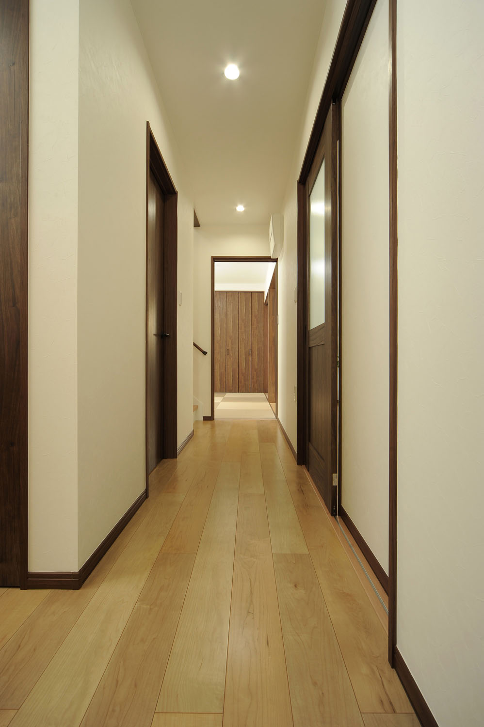 三浦建築設計が手がける住まいは、雪深い県南地域で冬の暖かさに定評がある。住宅性能に関心があった施主のSさんは、自社大工が手がける木工事や実績のある断熱施工に共感を覚え、同社に新築工事を依頼した。プランニングではLDKに続くテラスがあることが第一の要望。バーベキューや子どもたちと花火を楽しむテラスや家族みんなの共有空間であるLDKを広く取り、同時に上下階のすべての部屋に明るさが届くよう窓も多く取られている。LDKとフラットに続いたモダンな和室まわりは、特に客間としての使いやすさを優先した設計。まずは直接出入りができるよう、玄関正面に配置した。そして和室から洗面・トイレ・浴室へと一直線に廊下でつないでいる。これは県外出身の奥さんのご両親に気兼ねなく滞在してもらうための動線。LDKを通らずに出入りでき、娘の嫁ぎ先でも自分たちのペースで過ごしてもらうための配慮だ。玄関を入ってすぐの位置にあっても、Sさんも納得の住宅性能で寒さとは無縁だ。