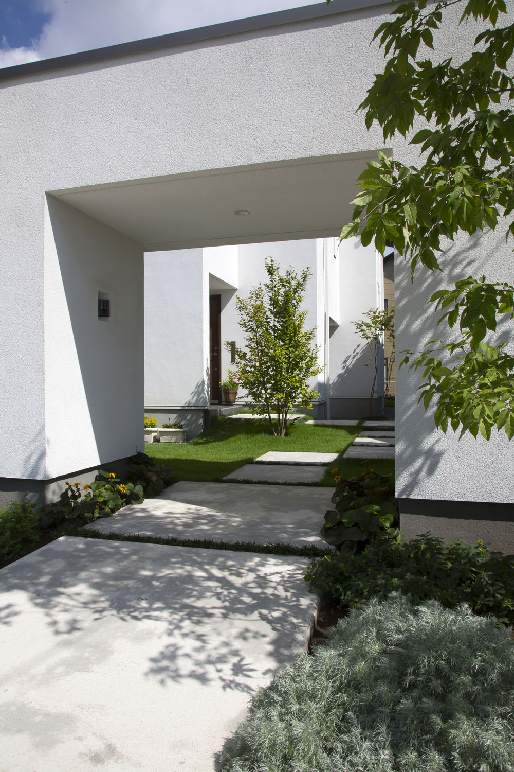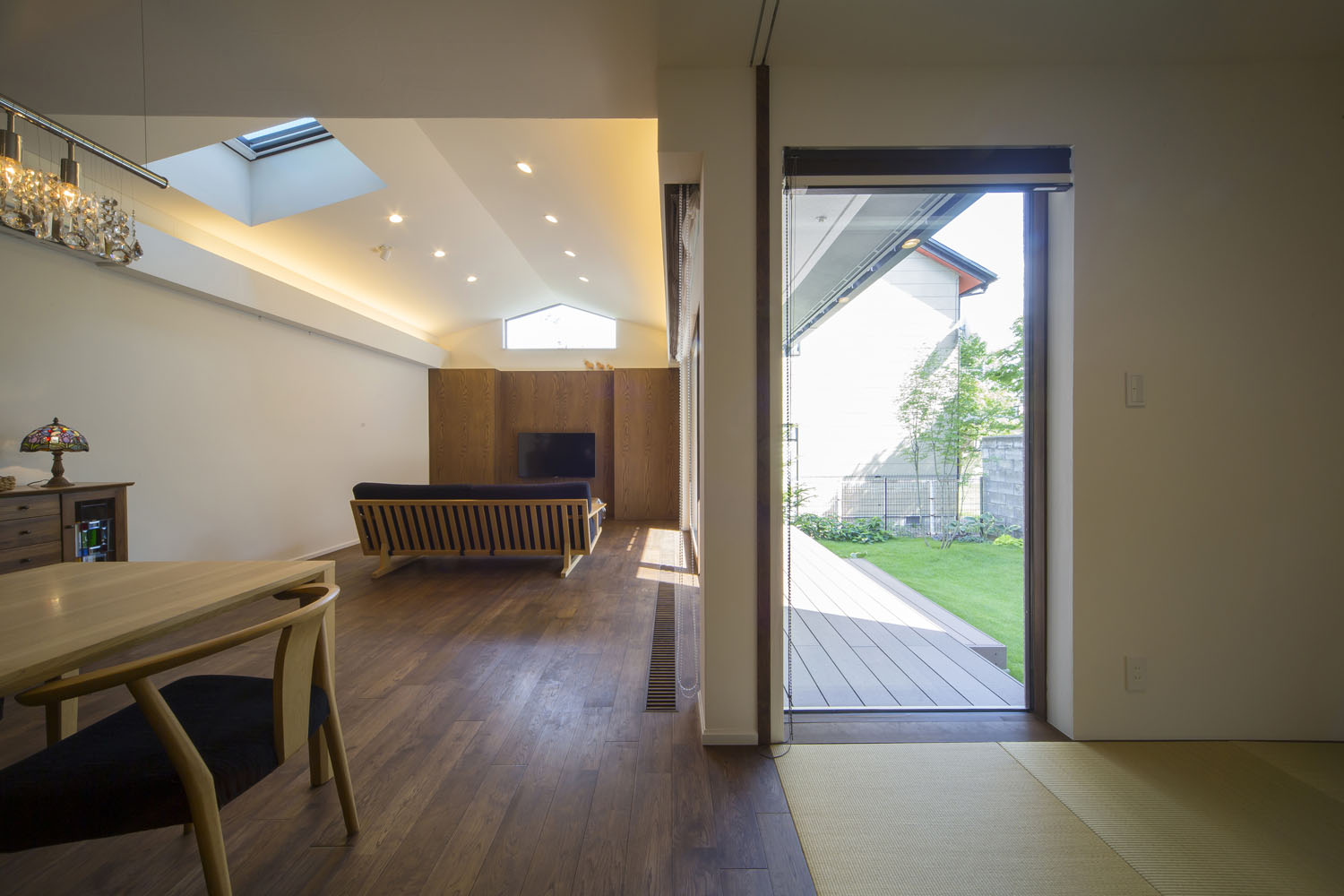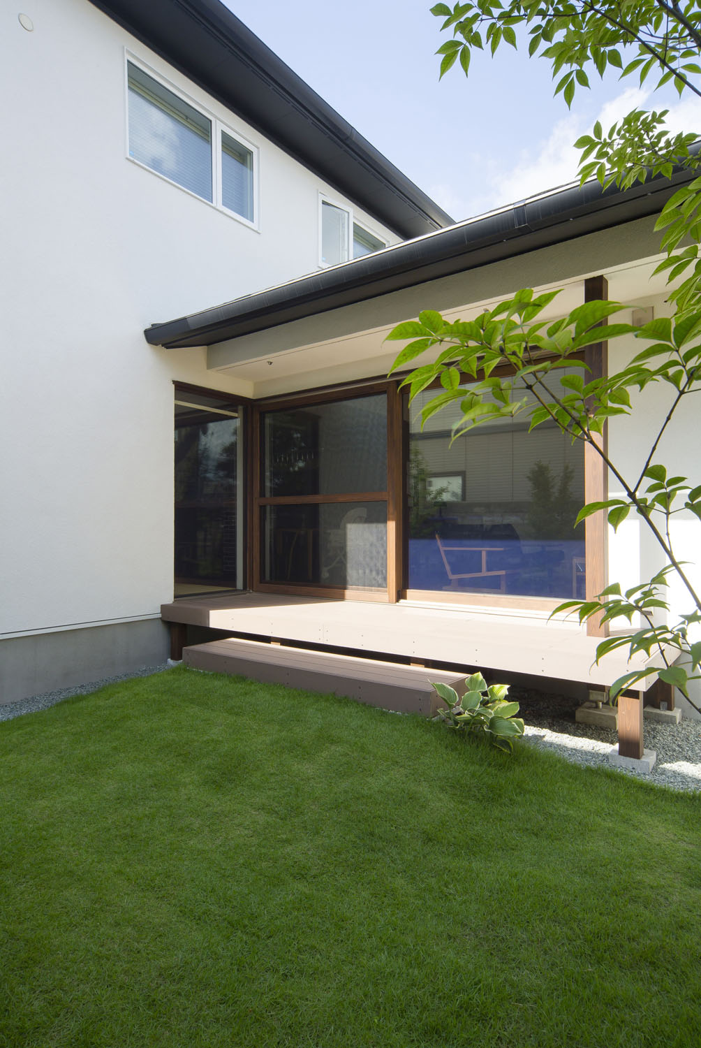 Y邸のリビングはとても静かだ。市街地とは思えないほどに、車通りを感じない。屋根の形状に沿ったデザインのハイサイドライトは周囲の木々を映し、天窓からは柔らかな明かりが届く。三方が隣家に接しているのに、その存在が気にならないのは、開口の配置が考え込まれているからだ。この静けさの第一の功労者といえるプライベートガーデンは、車寄せの先にある重厚な構えのゲートが守っている。門から玄関までのアプローチは、石盤が見せる端正な存在感と、植栽のゆらぎが気持ち良く調和し、訪れる人の目を楽しませると同時に、そこにたやすく足を踏み入れることを許さない厳格さを持っている。この敷地の奥行きを生かしたプランニングがY邸のリビングに静寂をもたらすのだ。子どもたちの友人が集うと、この庭はたちまち遊び場に変わる。「家の周囲を一周できるので、みんなで走り回っています。車も気にしなくていいので有り難いです」と奥さん。外でのびのびと遊べる環境は、昨今では貴重な場となった。当たり前では得られない静けさや安全という環境が、建築によってつくられている。