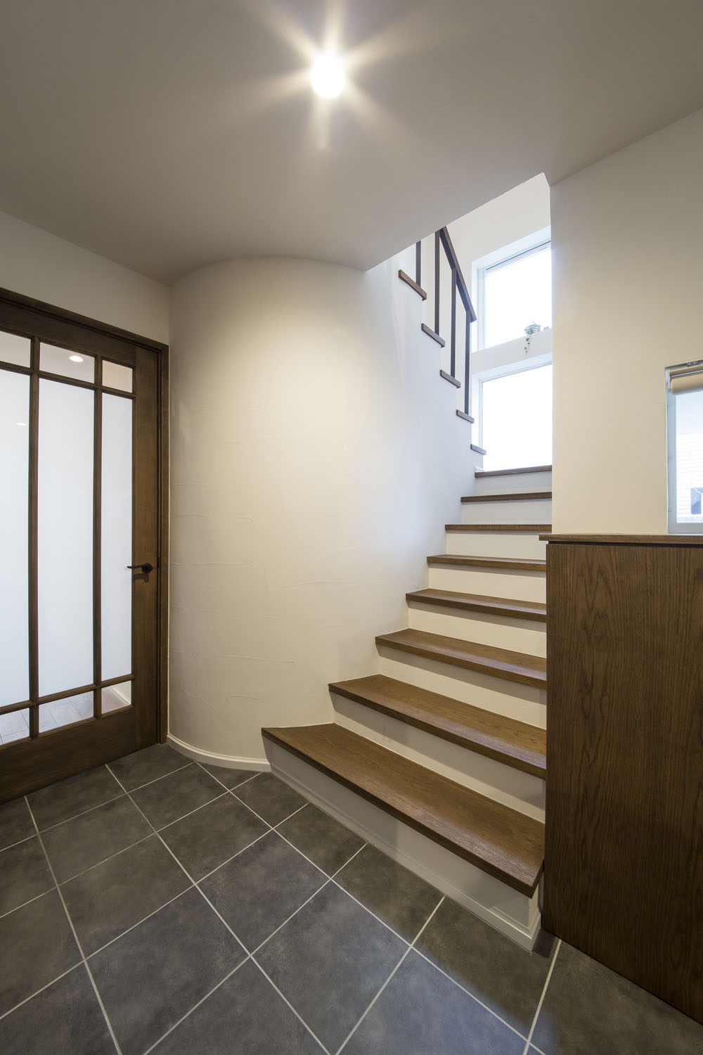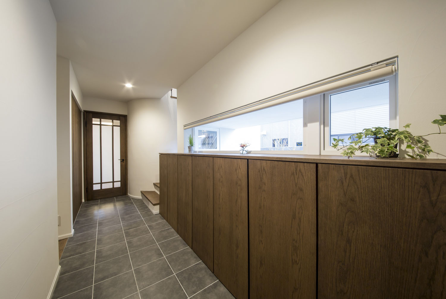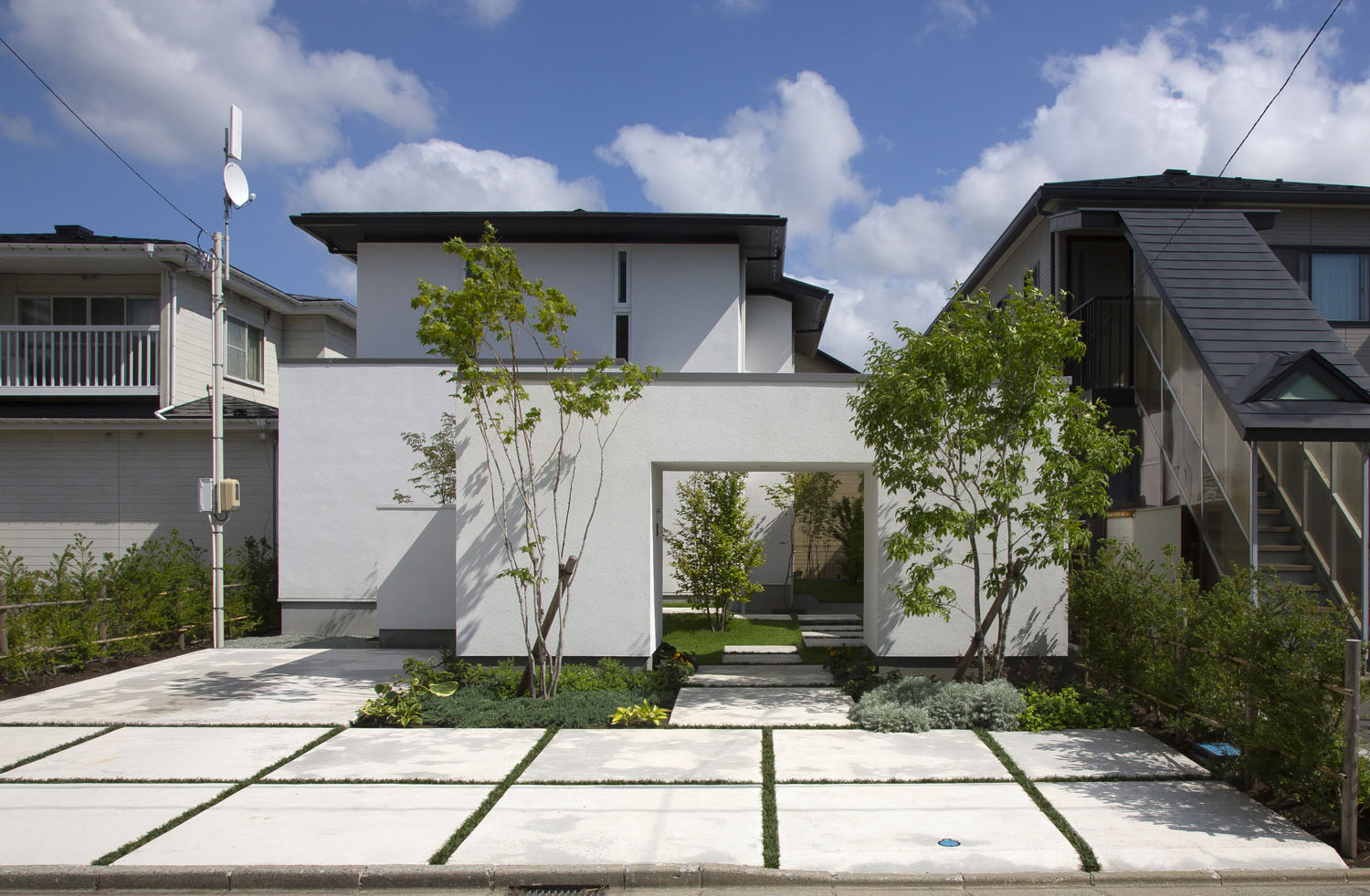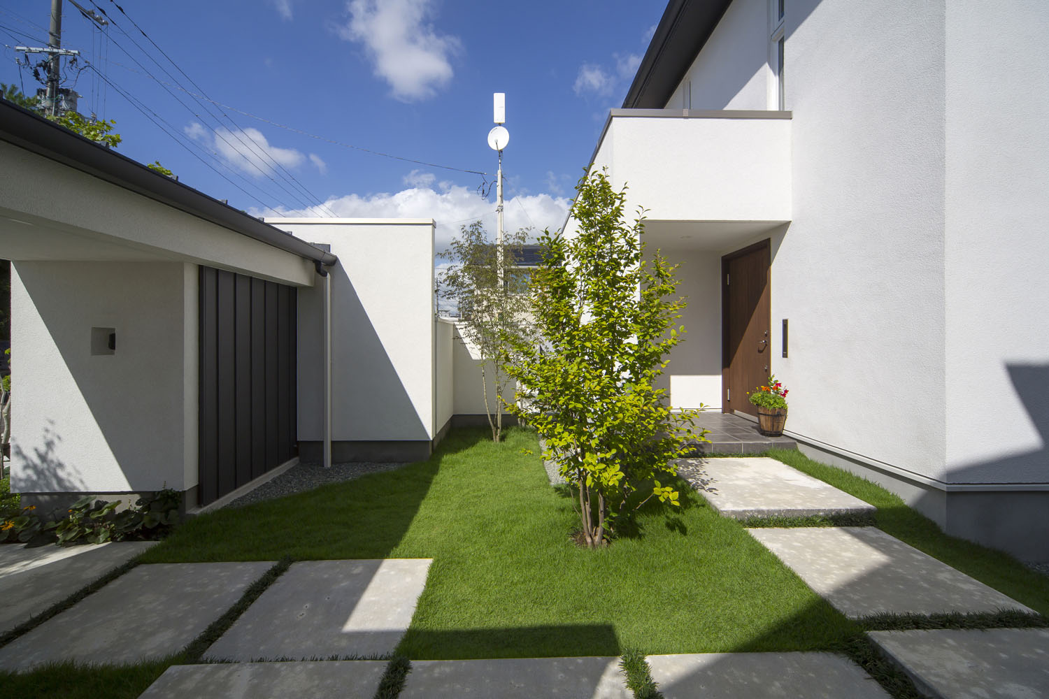 Y邸のリビングはとても静かだ。市街地とは思えないほどに、車通りを感じない。屋根の形状に沿ったデザインのハイサイドライトは周囲の木々を映し、天窓からは柔らかな明かりが届く。三方が隣家に接しているのに、その存在が気にならないのは、開口の配置が考え込まれているからだ。この静けさの第一の功労者といえるプライベートガーデンは、車寄せの先にある重厚な構えのゲートが守っている。門から玄関までのアプローチは、石盤が見せる端正な存在感と、植栽のゆらぎが気持ち良く調和し、訪れる人の目を楽しませると同時に、そこにたやすく足を踏み入れることを許さない厳格さを持っている。この敷地の奥行きを生かしたプランニングがY邸のリビングに静寂をもたらすのだ。子どもたちの友人が集うと、この庭はたちまち遊び場に変わる。「家の周囲を一周できるので、みんなで走り回っています。車も気にしなくていいので有り難いです」と奥さん。外でのびのびと遊べる環境は、昨今では貴重な場となった。当たり前では得られない静けさや安全という環境が、建築によってつくられている。