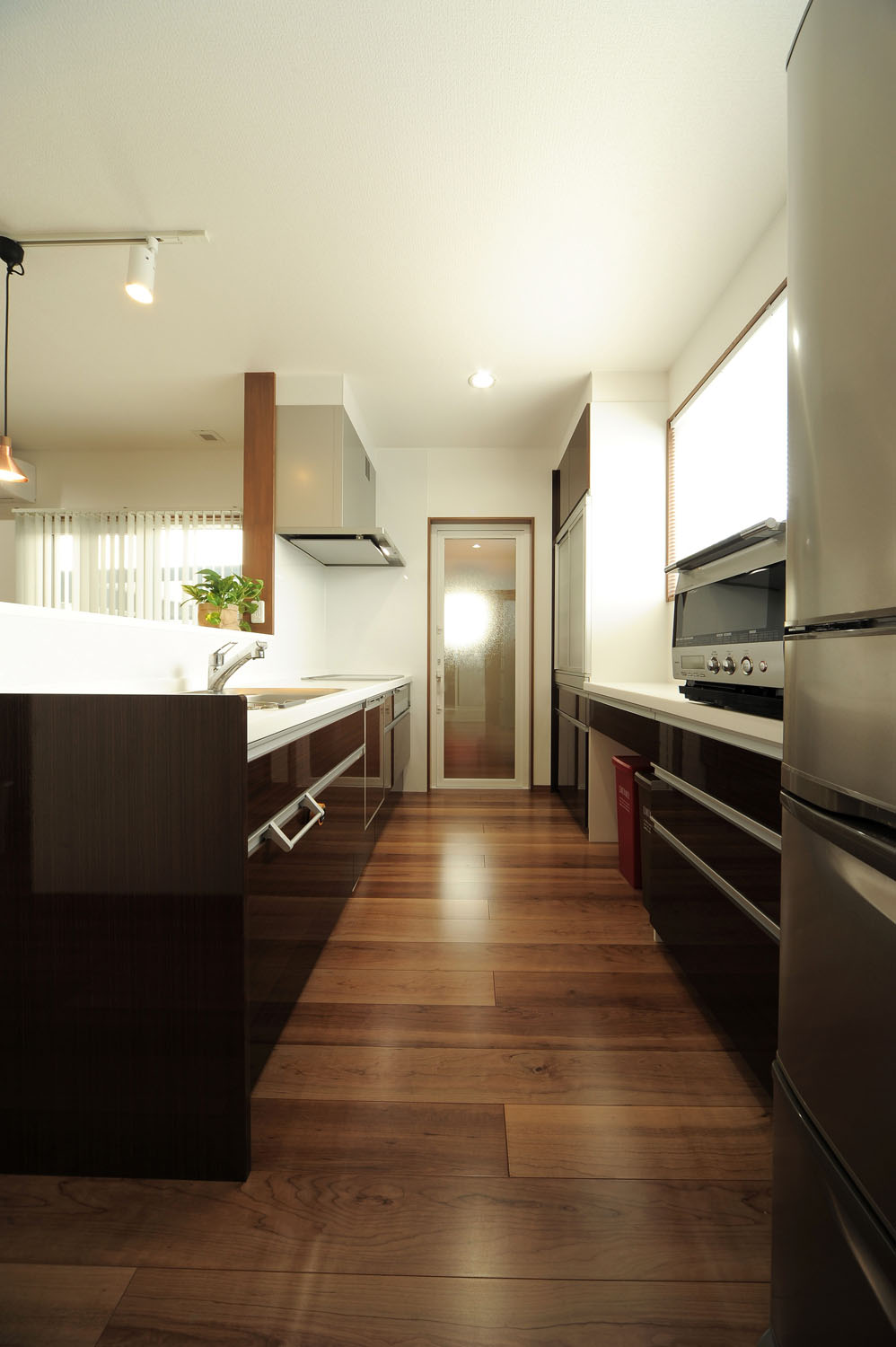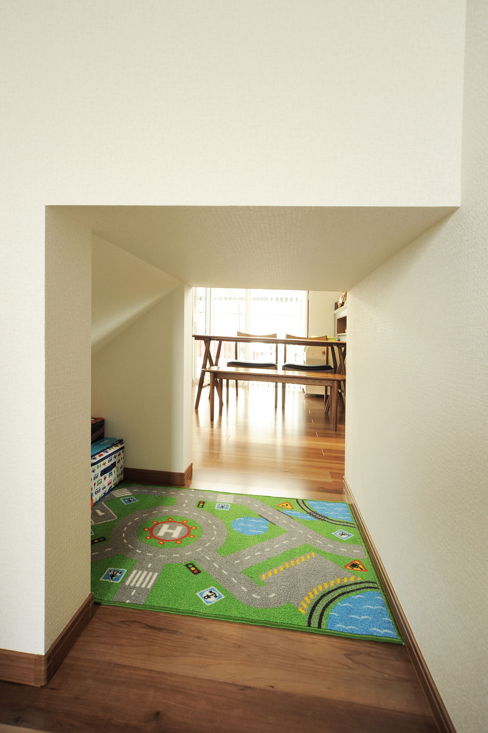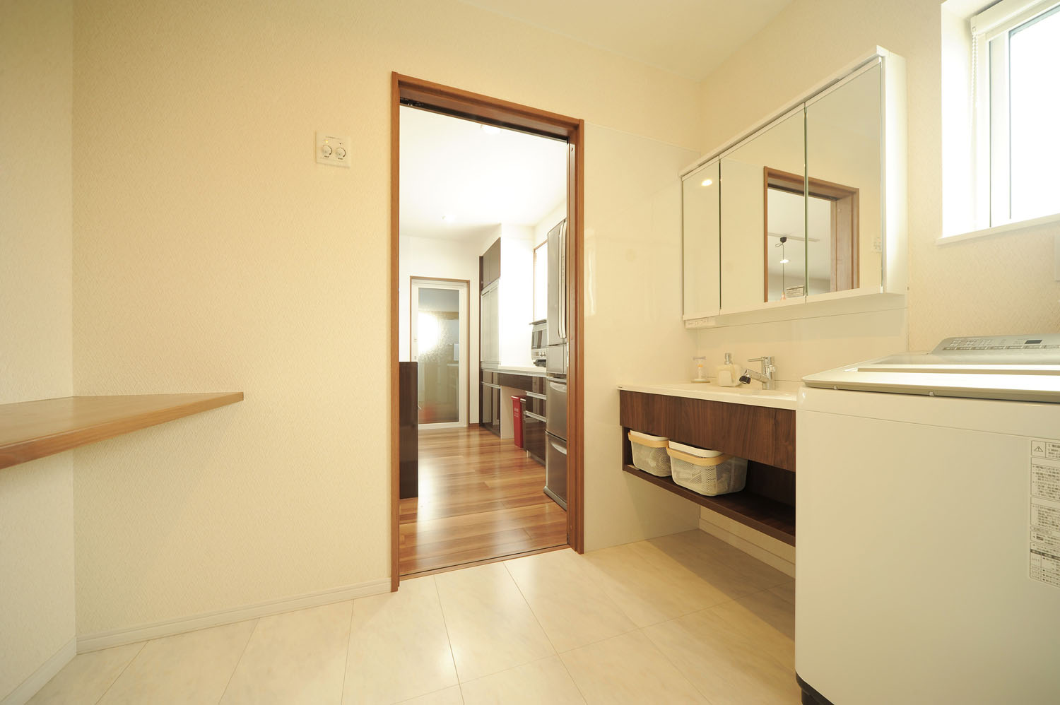 ともに忙しい仕事を抱えているKさん夫妻。子育てとの両立のため、新居の設計では働く女性をサポートするストレスフリーの家事動線が欠かせない。水回りのスペースは直列で並べられ、キッチンには広いパントリー。三浦建築設計の住まいは断熱性能が高い躯体のため、パントリーは非断熱エリアとして冬場の野菜貯蔵ができるようになっている。第二の冷蔵庫のような広いパントリーと、収納たっぷりのⅡ型のキッチンが並び、ツールや調味料・食器を引き出しごとにカテゴリ分けして仕舞う。育ち盛りの子どものいる家庭では、夕食支度は時間との勝負。この分別よって必要なものを探しやすくなり、調理スピードが早くなる。また、脱衣スペースは作業用カウンターを設け、活発な男の子の洗濯物の予備洗いや裁縫仕事がしやすいよう配慮されている。こうした小さな使い勝手が忙しい毎日の煩わしさを減らし、Kさんの負担を軽くしている。これからの社会で女性が笑顔で活躍するために、家の機能性は極めて重要であると言える。