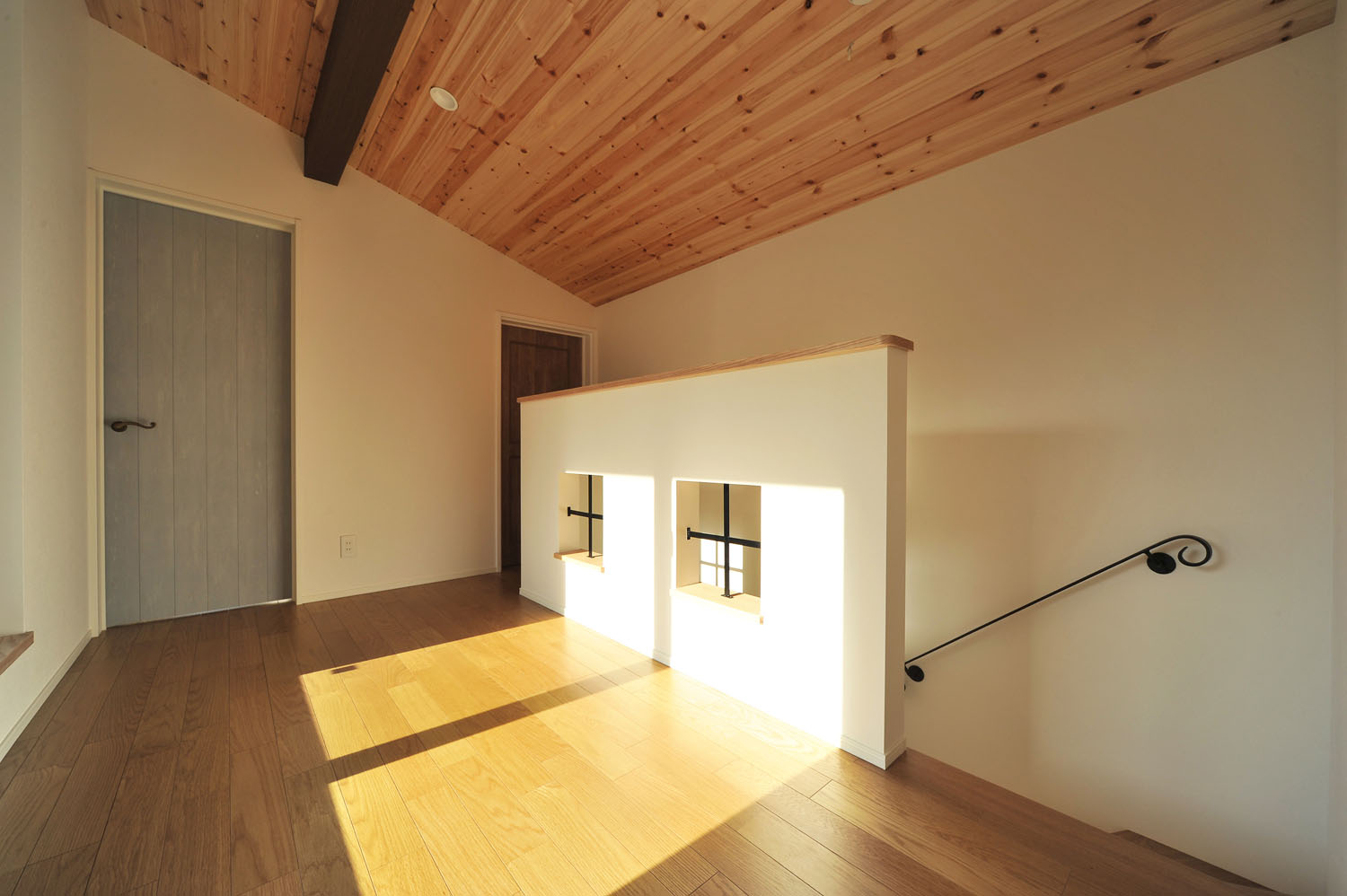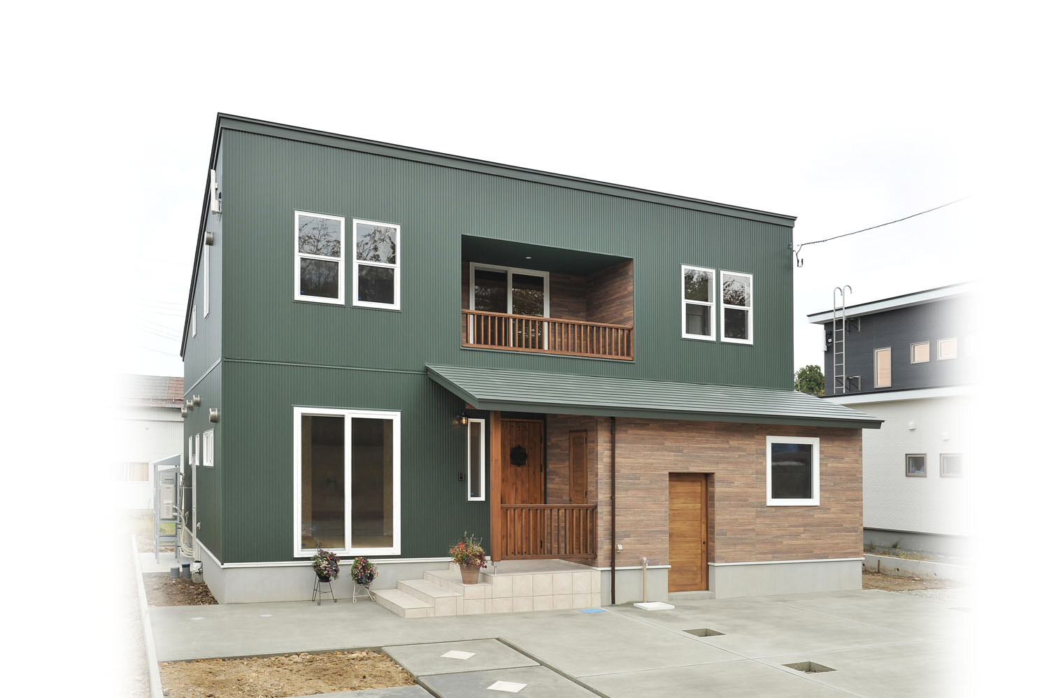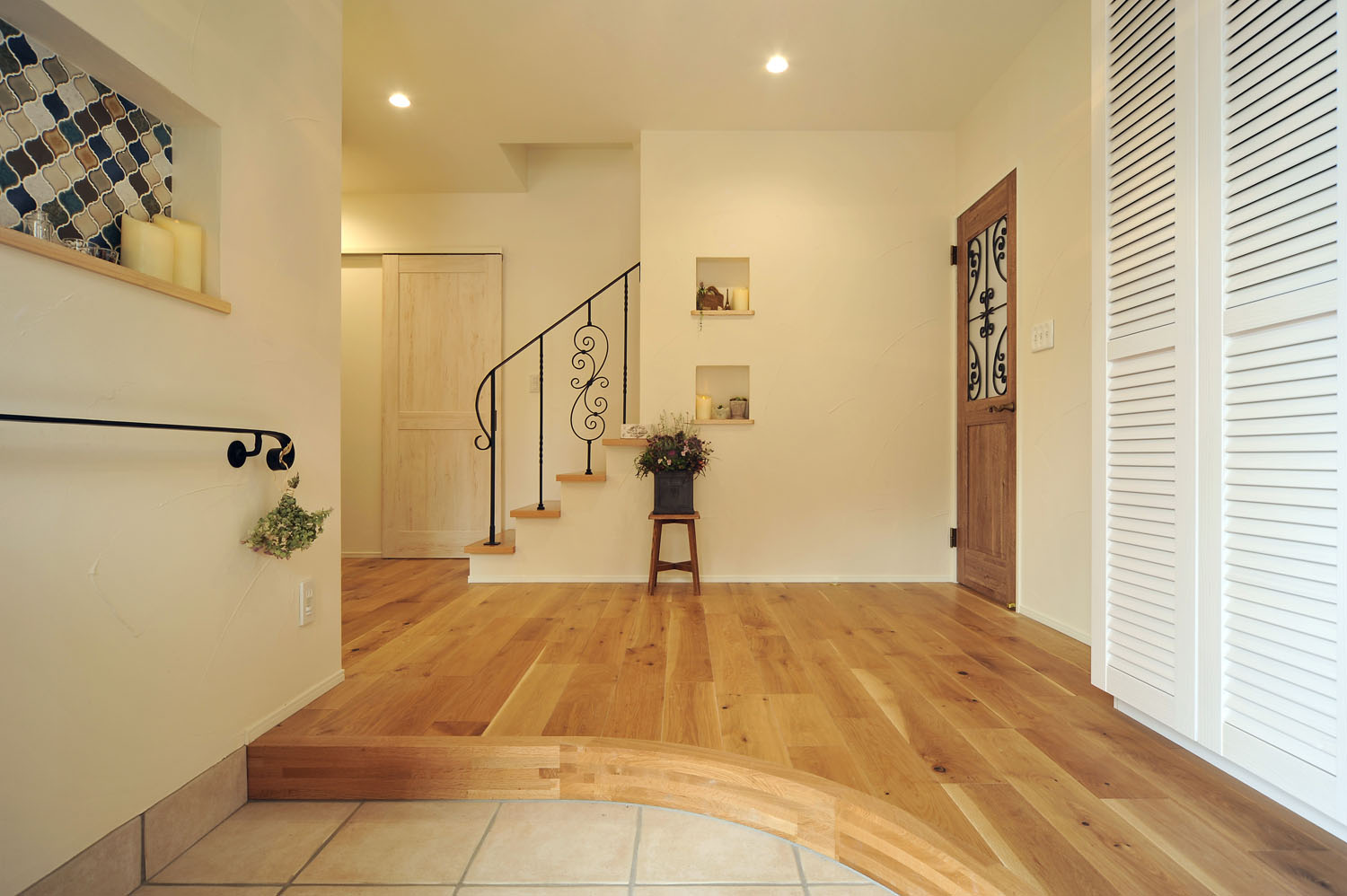 寒くて長い冬、大半を家の中で過ごす北国の私たちにとって、インテリアは豊かな暮らしのための大切な要素だ。空間の演出に趣向を凝らした伊藤建友の「アンティークスタイルの家」は、女性設計士による生活動線に配慮したプランに加え、随所にその家の特徴となるような造作を取り入れたオーダーメイド住宅。外観デザインの多くは洋瓦や塗り壁が多いが、豪雪地帯の横手市に建つこのS邸は、自然落雪する片流れ屋根や大きな外物置、外形から見て室内へ向けて凹状に取った深い軒のあるベランダなど、雪に配慮した外観形状。深い緑色の金属サイディングと木調の外壁の色彩が、自然豊かな土地柄になじんでいる。玄関ドアを開けると、室内は白壁とナチュラルな素材でコーディネートされたやわらかな印象の空間。約7帖の玄関ホールの広さは、来客の多い施主Sさんの希望によるものだ。モダンなインテリアの和室とリビングへの扉が玄関ホールの左右に控え、床暖房のおだやかな暖かさの空間が広がっている。