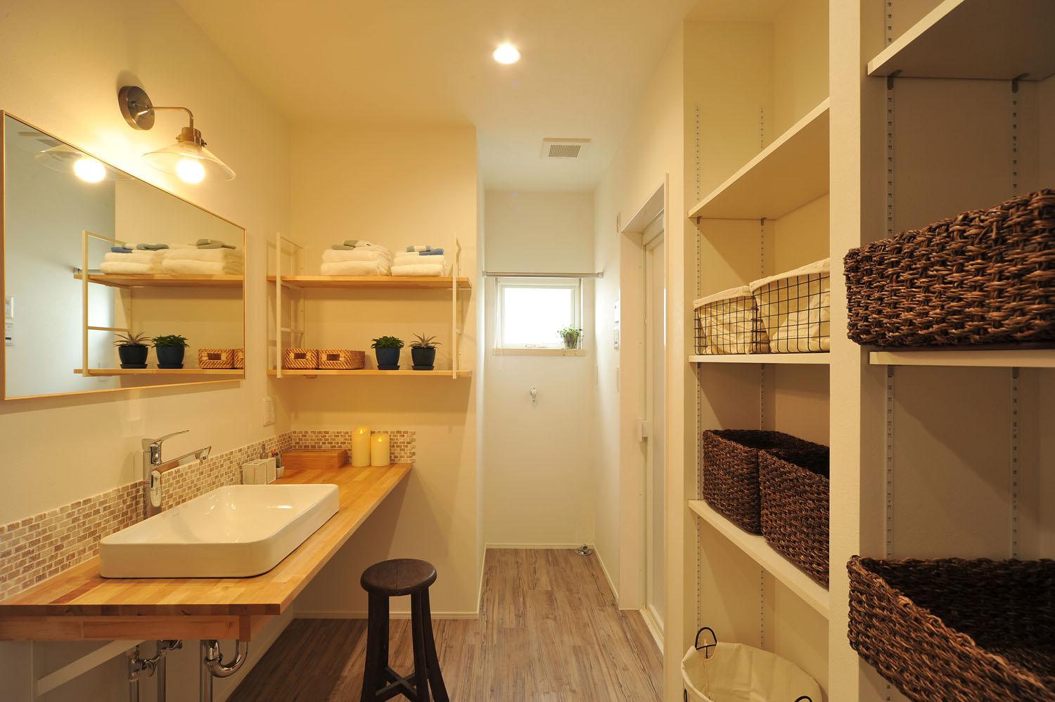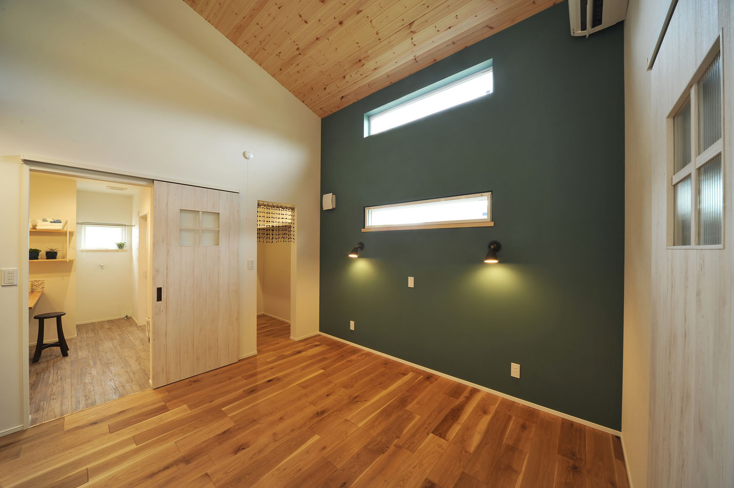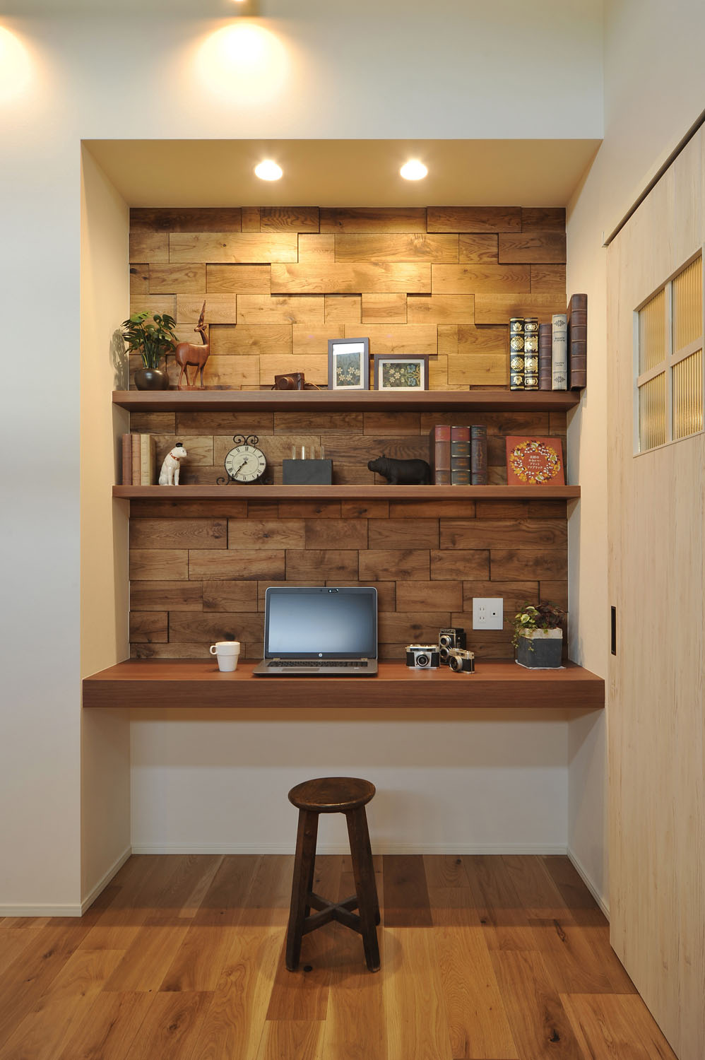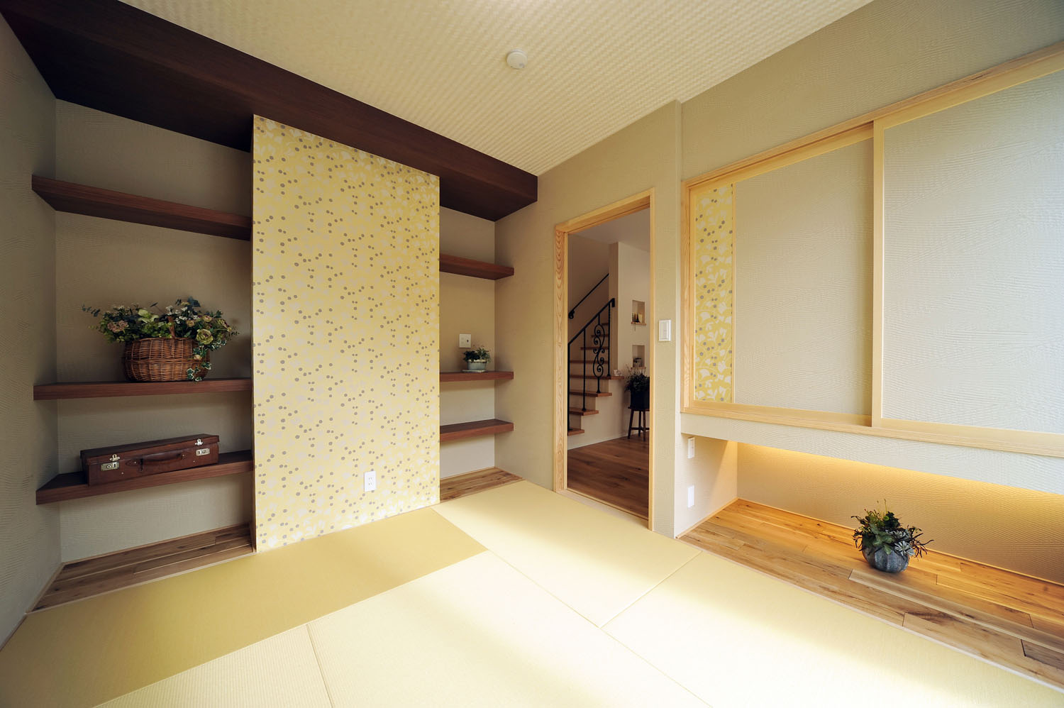 寒くて長い冬、大半を家の中で過ごす北国の私たちにとって、インテリアは豊かな暮らしのための大切な要素だ。空間の演出に趣向を凝らした伊藤建友の「アンティークスタイルの家」は、女性設計士による生活動線に配慮したプランに加え、随所にその家の特徴となるような造作を取り入れたオーダーメイド住宅。外観デザインの多くは洋瓦や塗り壁が多いが、豪雪地帯の横手市に建つこのS邸は、自然落雪する片流れ屋根や大きな外物置、外形から見て室内へ向けて凹状に取った深い軒のあるベランダなど、雪に配慮した外観形状。深い緑色の金属サイディングと木調の外壁の色彩が、自然豊かな土地柄になじんでいる。玄関ドアを開けると、室内は白壁とナチュラルな素材でコーディネートされたやわらかな印象の空間。約7帖の玄関ホールの広さは、来客の多い施主Sさんの希望によるものだ。モダンなインテリアの和室とリビングへの扉が玄関ホールの左右に控え、床暖房のおだやかな暖かさの空間が広がっている。