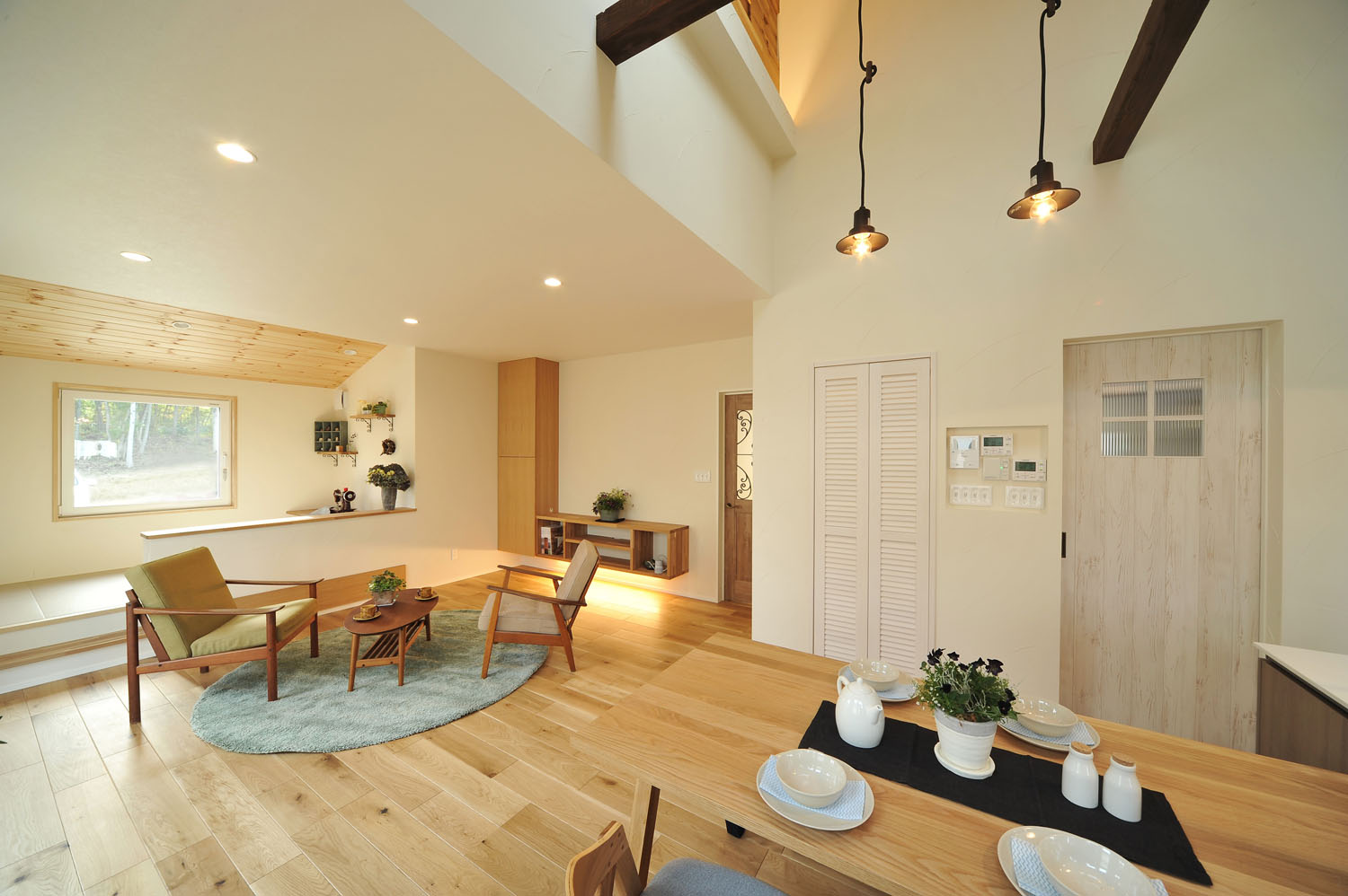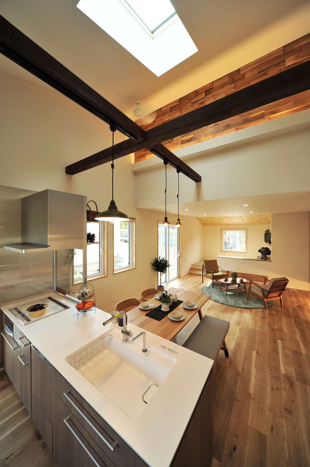 24帖ものLDKは、ゾーンごとに違った居心地が楽しめるよう、建物の屋根勾配を生かしながら天井高を変化させている。畳の小上がりには小空間の落ち着き、ダイニングには吹き抜けと天窓のある解放感、キッチンにはひとつながりとなったその緩急を一望する見晴らしと、それぞれ異なる居心地を計画。それによって、つながった全体を抑揚のある空間に仕上げた。我が家としての愛着を感じさせるインテリアにこだわりながら、収納の配置や容量、実用を重視したシステムキッチンのセレクトなど、生活に根ざした目線による配慮もぬかりない。キッチンは広い主寝室と隣合わせ、その先には洗面所と浴室、そこから玄関へとつながっており、1階は行き止まりのない回遊動線。2階フロアには子ども室と納戸が配され、夫婦二人の生活は平屋のように1階だけで完結する設計だ。ストレスのない動線と日常に豊かさを感じさせるインテリアは、雪に閉ざされる長い冬、室内の時間が多い雪国でこそ、その価値が切実に感じられる。