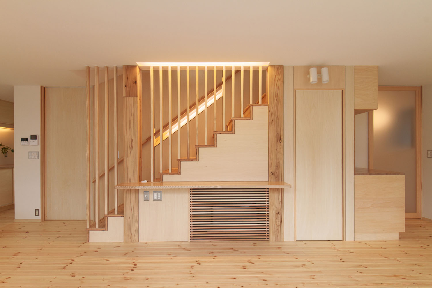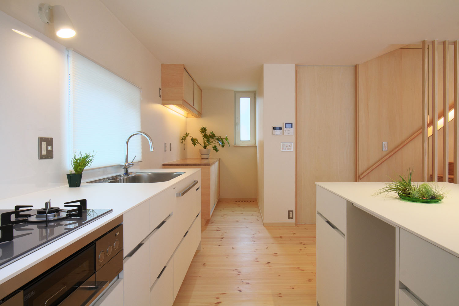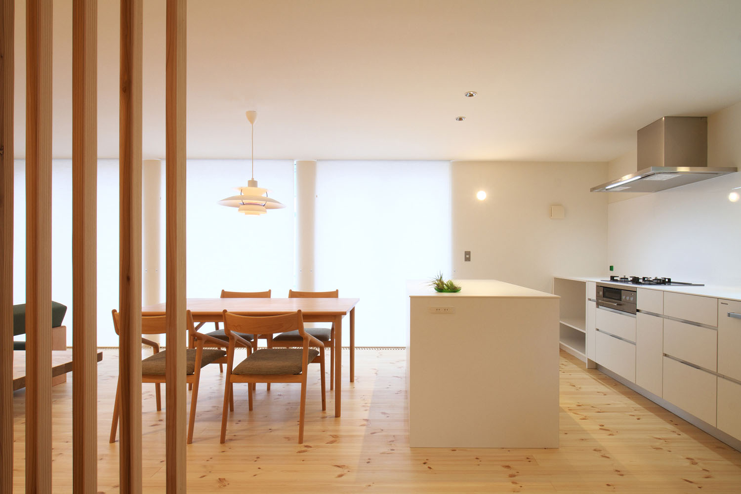 キッチンハウス社のオーダーキッチンが主役の料理を楽しむLDKは、天井に高さを揃えた大きな窓が南側の壁一面に取られている。広々とした空間に広がるやわらかな陽の光。S邸の特徴のひとつは、窓や建具のレールや枠を埋め込み、極力段差ができないように線を揃えて、光の広がりを阻むものを最小限にした空間設計だ。そのうえで南側には開口部を大きく取り、道路に面した北側では極力閉じることによって室内に明暗の差が生まれ、遮るもののない広々とした天井の南側から北側へ向けた、きれいな光のグラデーションがつくられている。この対比による心地良さは光の明暗だけでなく、ふんだんに室内に使われた木材の組み合わせにも見て取れる。節のある無垢の松の床で、木が本来持つ自然のゆらぎを空間に投影し、他の造作部分では控え目なシナ合板を用いることで動と静の対比をつくり、その均衡した様子が人にやすらぎを感じさせる。光と木に包まれるような居心地の住空間で、夫妻の北国での暮らしが始まった。