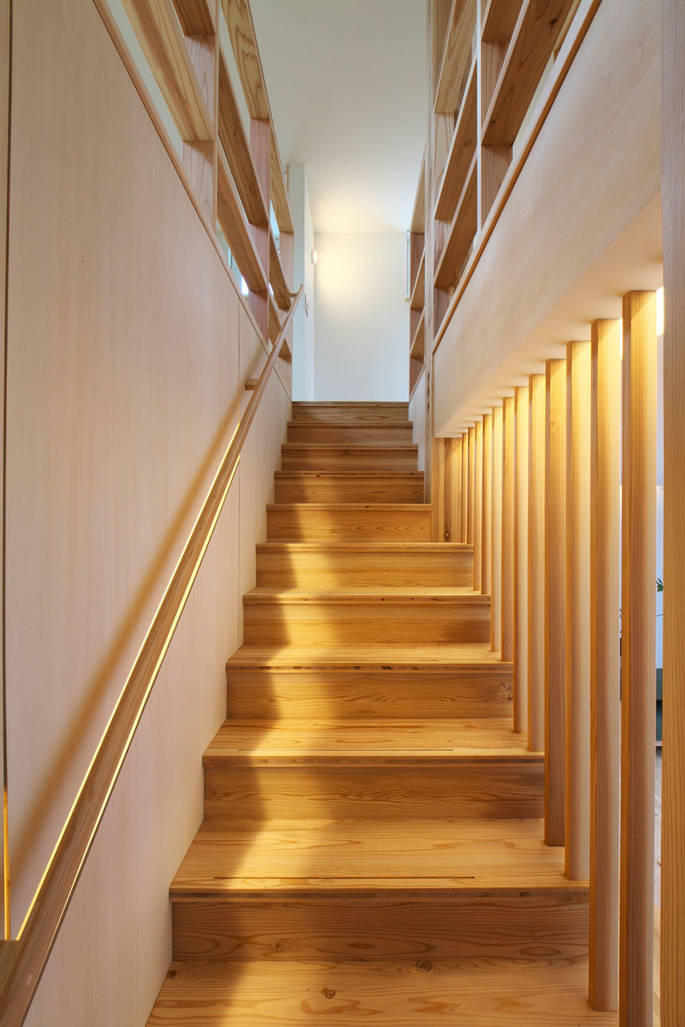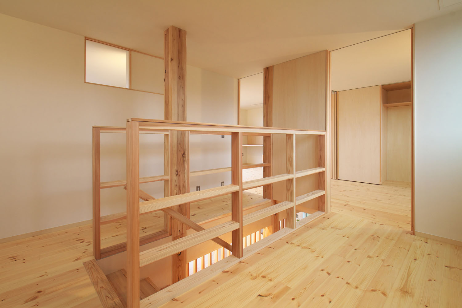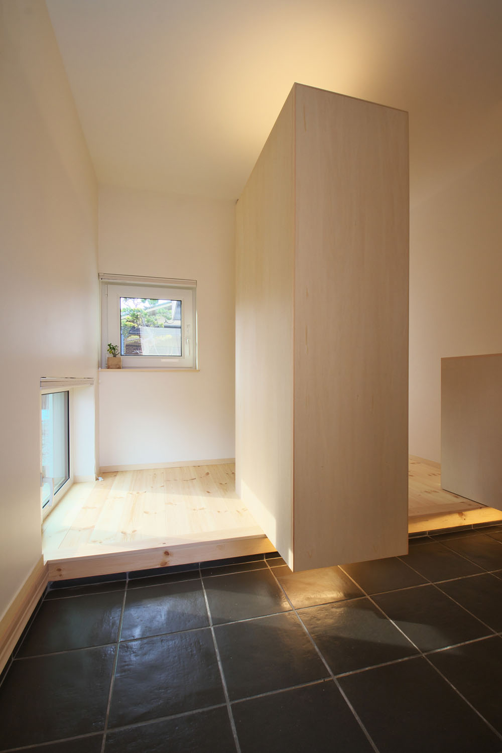 キッチンハウス社のオーダーキッチンが主役の料理を楽しむLDKは、天井に高さを揃えた大きな窓が南側の壁一面に取られている。広々とした空間に広がるやわらかな陽の光。S邸の特徴のひとつは、窓や建具のレールや枠を埋め込み、極力段差ができないように線を揃えて、光の広がりを阻むものを最小限にした空間設計だ。そのうえで南側には開口部を大きく取り、道路に面した北側では極力閉じることによって室内に明暗の差が生まれ、遮るもののない広々とした天井の南側から北側へ向けた、きれいな光のグラデーションがつくられている。この対比による心地良さは光の明暗だけでなく、ふんだんに室内に使われた木材の組み合わせにも見て取れる。節のある無垢の松の床で、木が本来持つ自然のゆらぎを空間に投影し、他の造作部分では控え目なシナ合板を用いることで動と静の対比をつくり、その均衡した様子が人にやすらぎを感じさせる。光と木に包まれるような居心地の住空間で、夫妻の北国での暮らしが始まった。