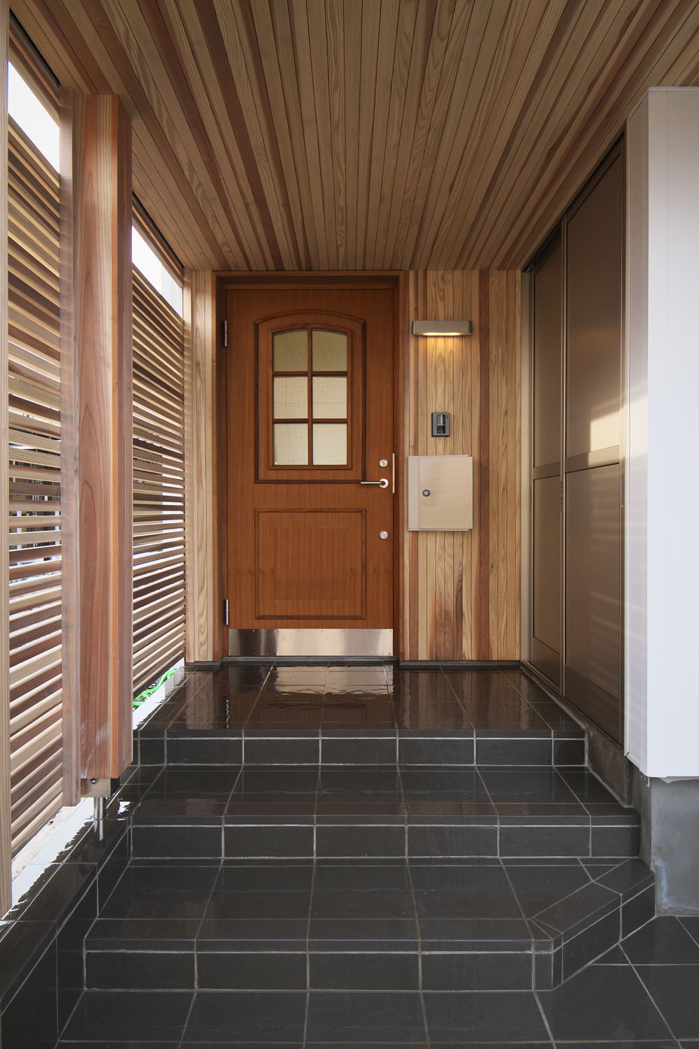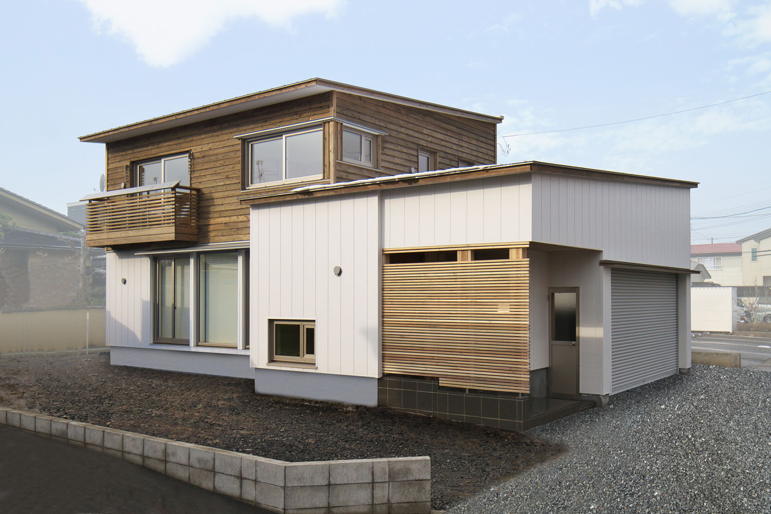 「新住協」という組織名を耳にしたことがあるだろうか。正式名称は「新木造住宅技術研究協議会」。住まいの快適な熱環境のための高断熱・高気密・高耐久の構造研究を目的とし、自然エネルギーの活用、化学物質を極力抑制した健康を守る住まいづくりなどを基本理念として、住宅技術を研究している技術開発団体だ。この住まいの施主であるSさんは、住まいづくりを学ぶ過程で新住協の存在を知り、会員として研鑽を重ねていたヨシの家と出会った。新居への一番の期待は低燃費で暖かいこと、それと明るさに満ちた空間であること。県外から転入する夫妻のために、冬の雪対策も慎重に検討。要望に基づき悪天候でも車の乗り降りに支障のないインナーガレージの住まいとなった。ガレージは道路から距離を置かずに入り口を設け、除雪の範囲を最小限にしている。また、玄関までのアプローチにも雪が積もらないよう屋根付きとし、あたたかみを感じる秋田杉を壁天井にあしらい、一方はルーバーとすることで採光にも配慮されている。