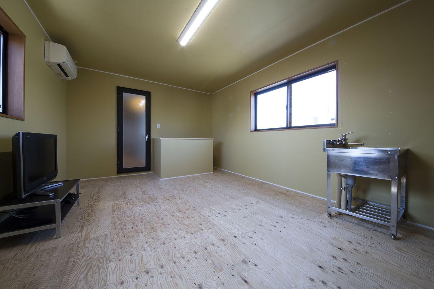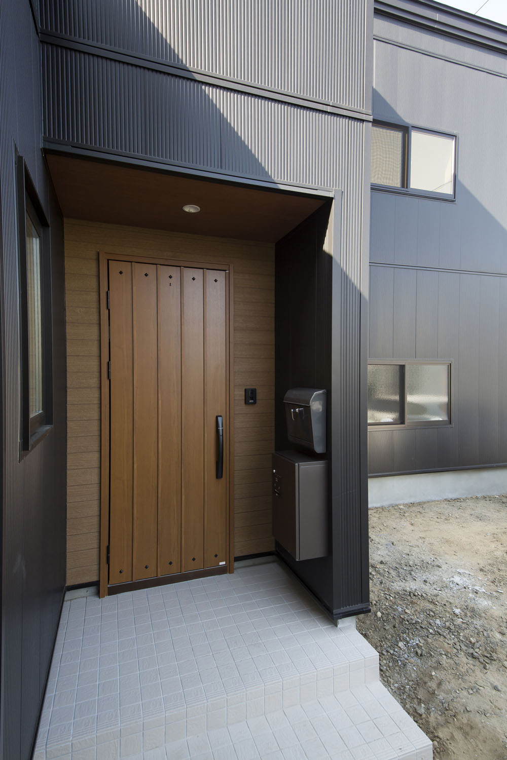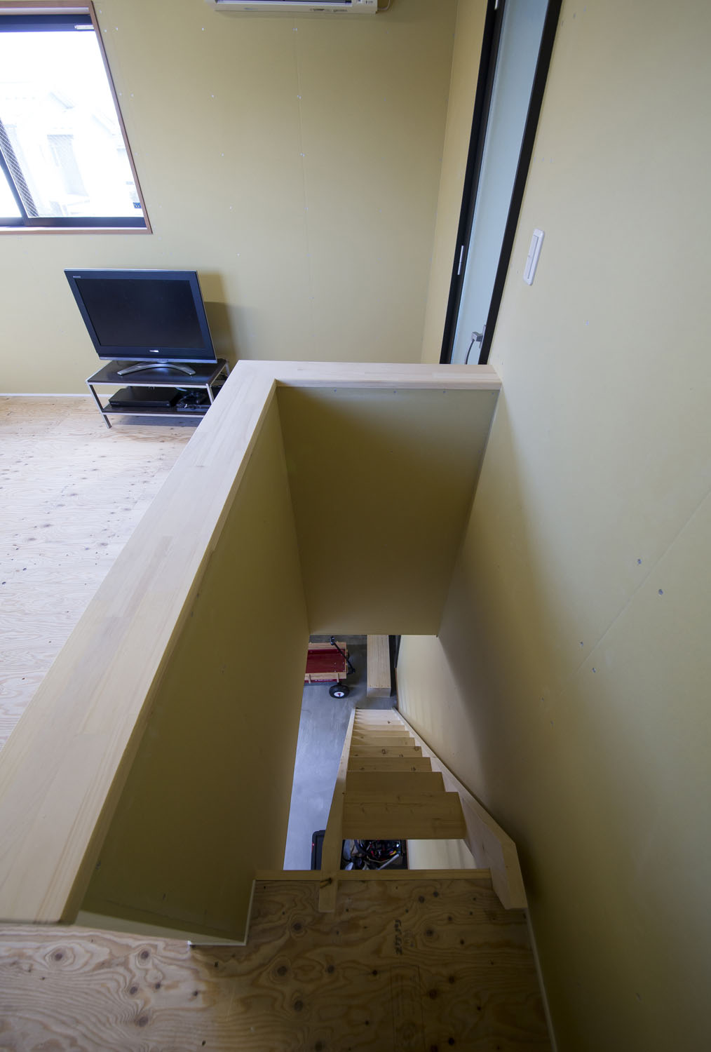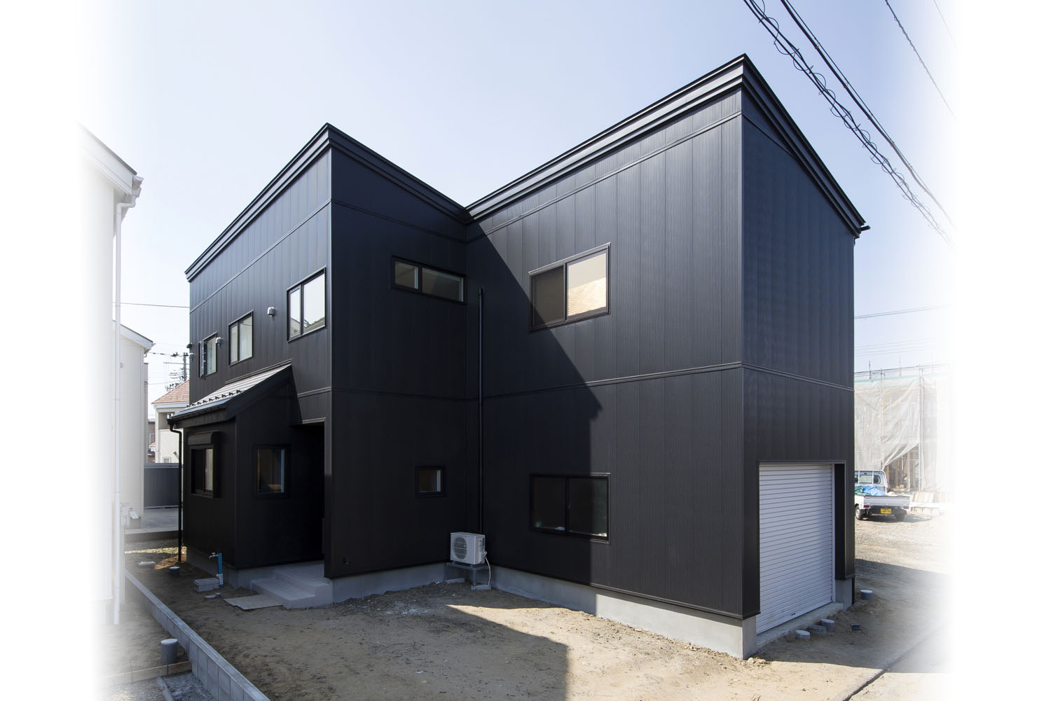 「永久の未完成、これ完成である」とは有名な詩人の言葉。多くの住まいは引渡し時が完成であるが、このS邸は住みながら完成を目指すセルフビルドのための余白が残されている。存在感ある黒のガルバリウム鋼板の建物の前方はインナーガレージとなっており、その2階部分が自分たちで工事を進めるDIY空間。下地と給排水を配置した状態で引き渡され、そこからは造作の木工事や内装工事を施主自らが手がけて、友人達と集うためのホームバーが誕生する予定だ。趣味と実益を兼ねた、木工仕事を得意とするご主人のための提案だ。住居スペースは1階フロアをLDKや水回りのある共有空間、2階をそれぞれの個室としている。両フロアの面積を均等にした箱型の形状は建築の効率だけでなく強度にもプラスに働く。ここに吉兆ホームの標準仕様である高耐震・高耐久の構造用集成材とクレテック金物の接合のストロングフレーム工法が加わることで、耐震・耐久性に優れた構造を実現している。