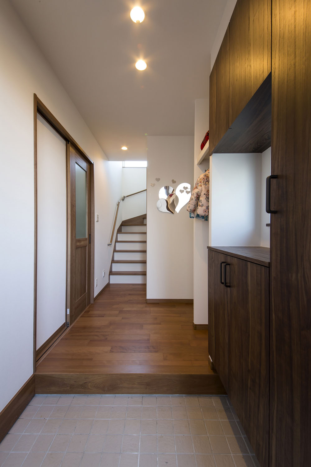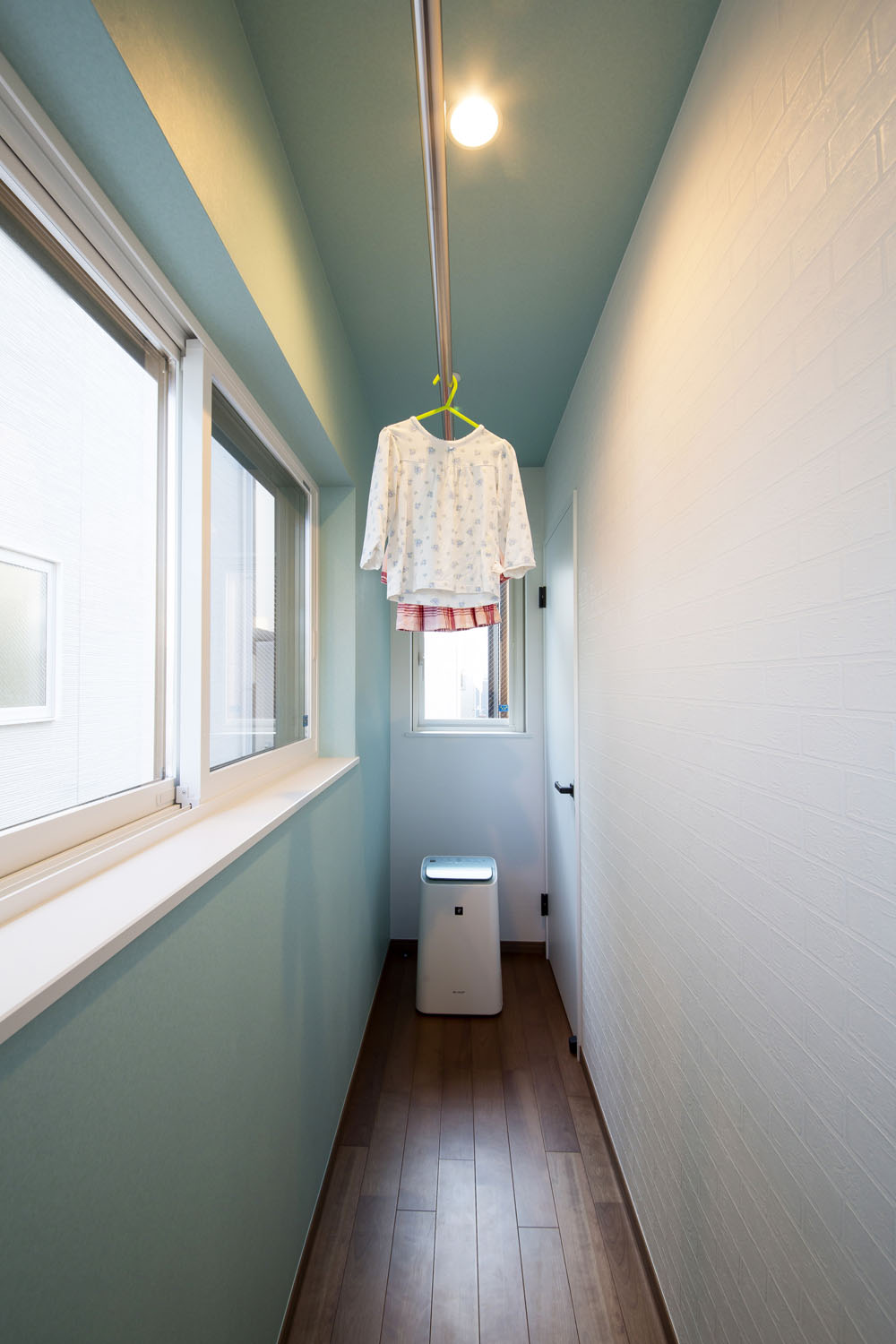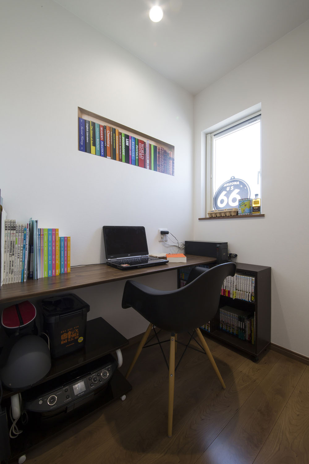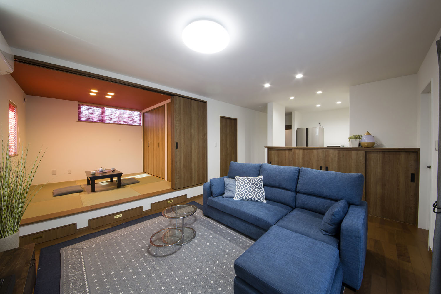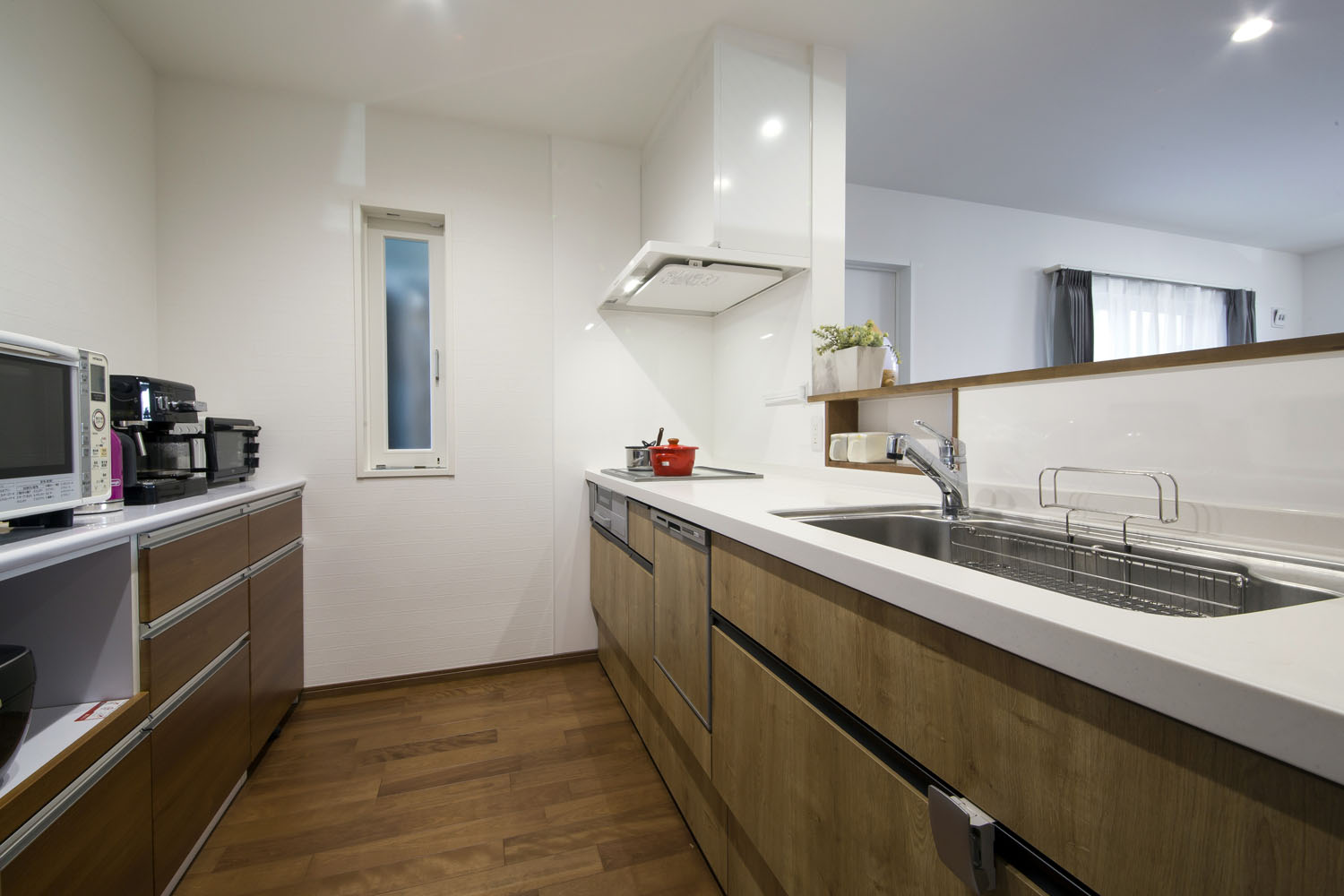 目下、3歳と1歳の二人の子育て中で、共働きのSさん夫妻。新居のプランニングにあたり、優先したのは家事負担をできるだけ少なくする動線だ。子どもたちに目を配りながら料理や洗濯などが同時進行でき、無駄を最小限にしたコンパクトな配置が求められる。また、子育て期は子どもの成長に比例して、年々物が増えていく。この先の増加分も見込み、収納はわずかな隙間も生かして余裕を持って計画された。作業の手元を隠すキッチンカウンターは高さを生かした大容量のリビング収納となっており、リビングに散乱しがちな生活道具類をまとめて収納。小上がりの段差を利用した床下収納はおもちゃや紙おむつなどのストック類を納めるなど、物の置き場所を予め計画しておくことで、片付けが苦にならない住まいとなっている。