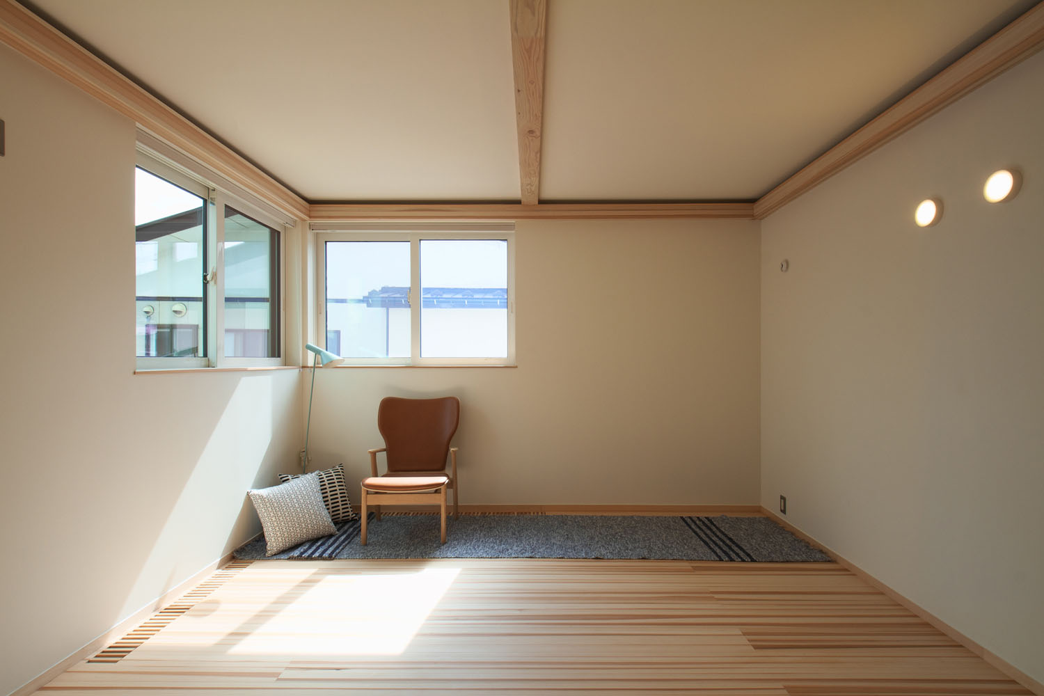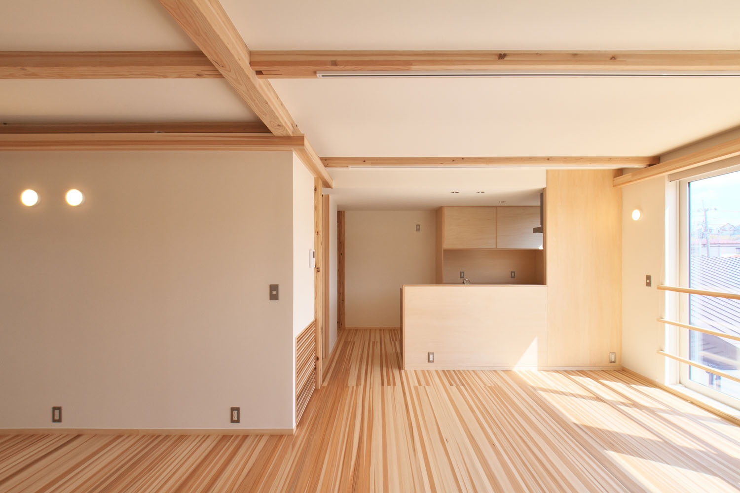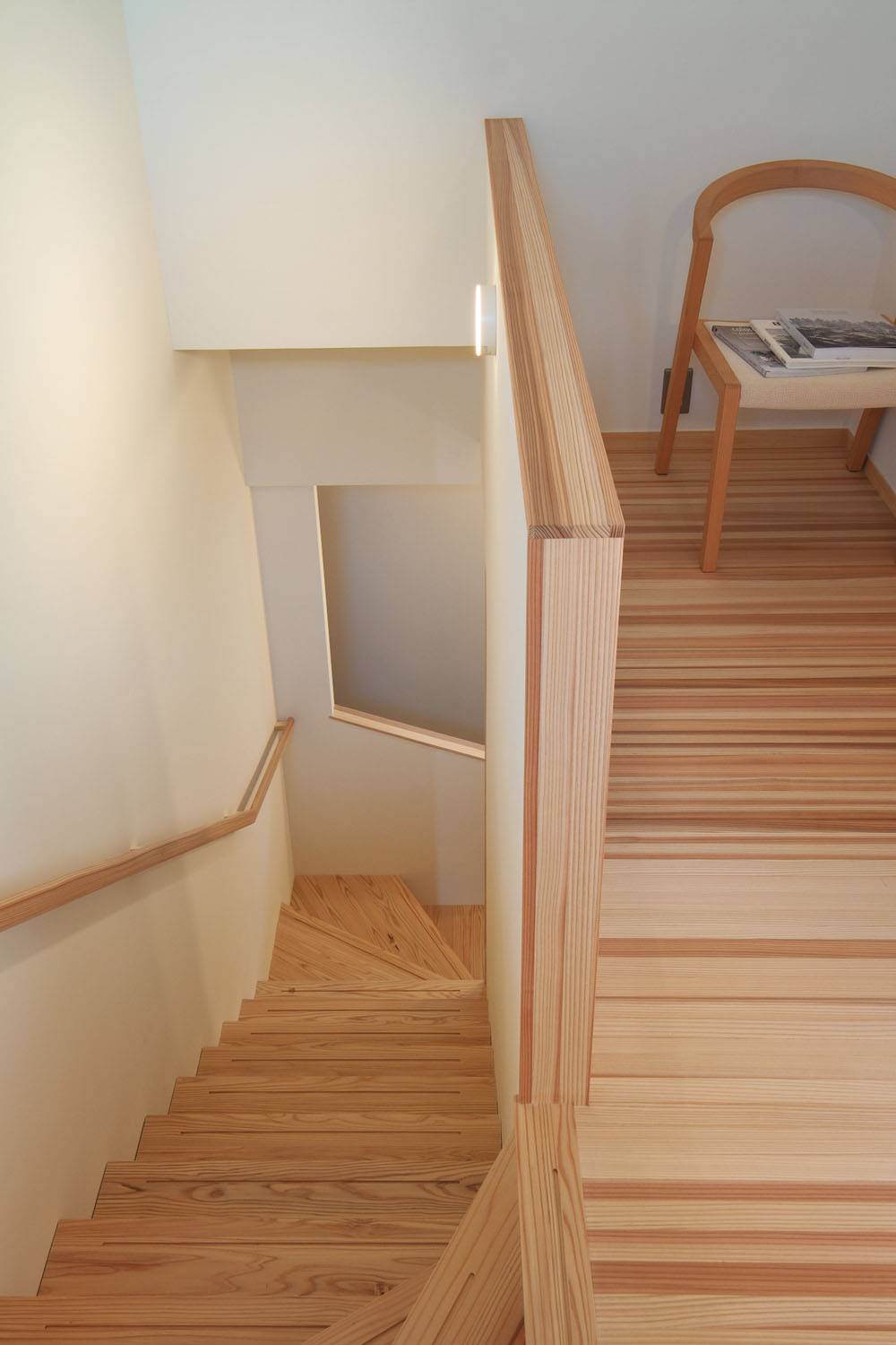 床材はヨシの家のオリジナルである柾目の杉板。杉は空気を多く含むため肌触りが柔らかく、温かい。資源が豊富でコストパフォーマンスにも優れており、傷つきやすい欠点を凌ぐだけの採用理由がある。「気持ちいいので、家に戻るとすぐ裸足になります。夏もサラサラです。前の家ではベタついていたので、素材で違いますね」とSさん。使うほどに暮らしに馴染む自然素材の選定は、愛着を持てる住まいづくりのため。ヨシの家では構造体と設備等が分離されたスケルトン・インフィルの考えのもとに、電気の配線も増設や移動が容易な工夫が取られ、素材だけでなく設備設計も吟味して、末永く暮らせる住まいづくりを心がけている。以前は軒が深く暗かったという室内は、南側の大きな窓からの日差しを塗り壁が拡散し、やわらかい明るさで満たされている。住宅性能も断熱気密を徹底することで、各階ともエアコン1台で全館の室温を調整できるスペックだ。上階の場合、夏はフロア全体に冷房が24時間行き渡った使用状況で過ごし、アパート時代の電気代との差が数百円。新居ではじめて過ごす冬の光熱費への期待が高まっている。