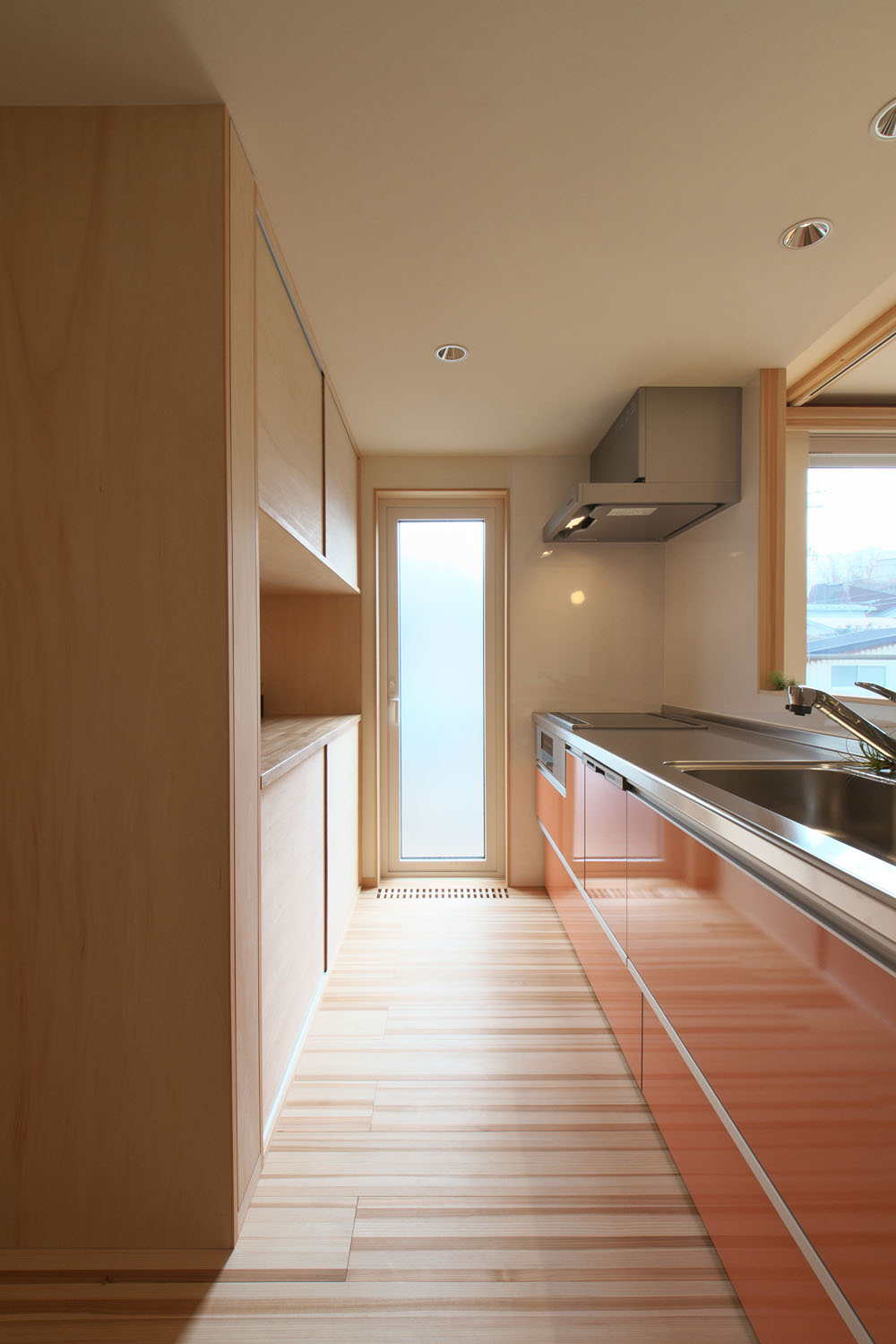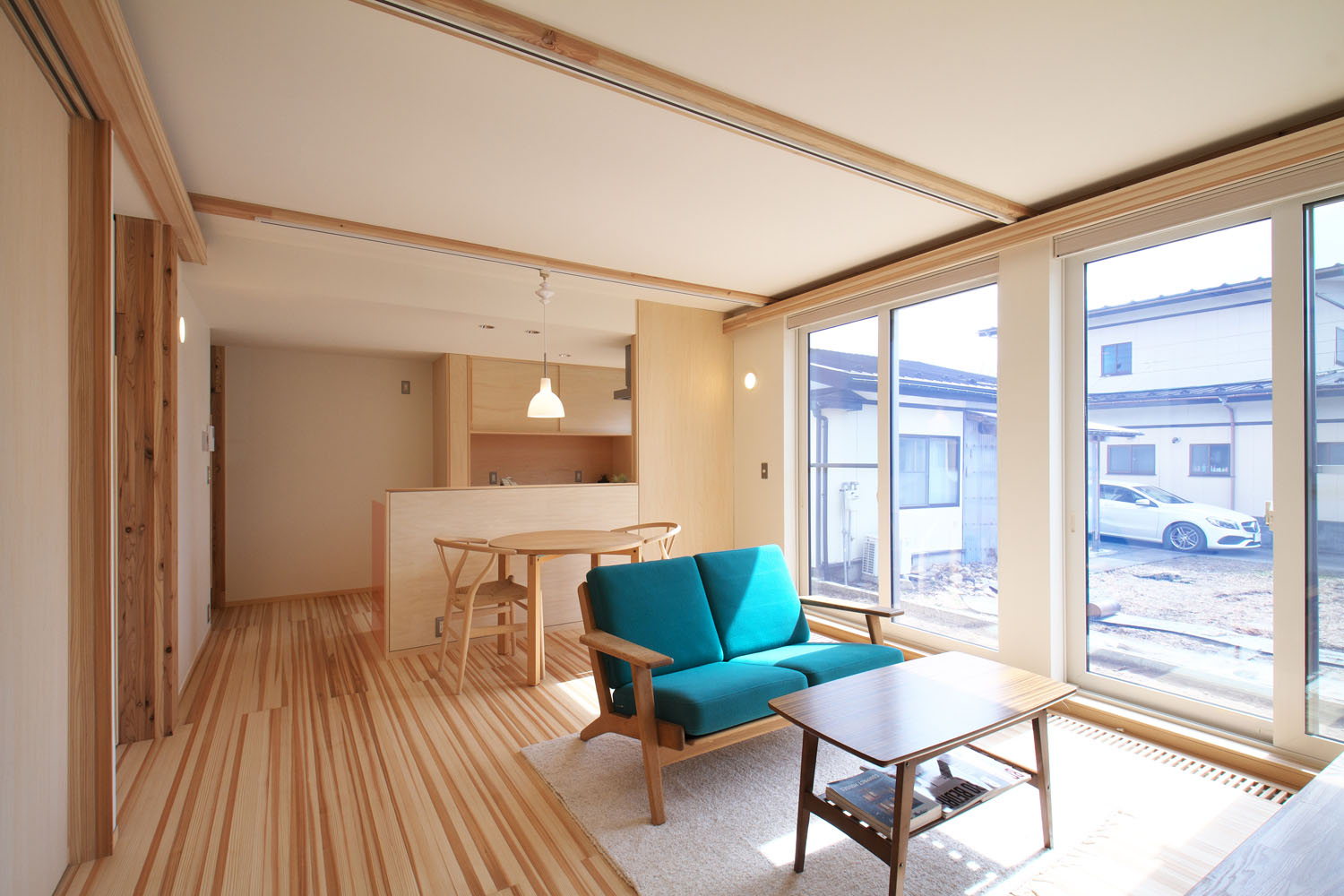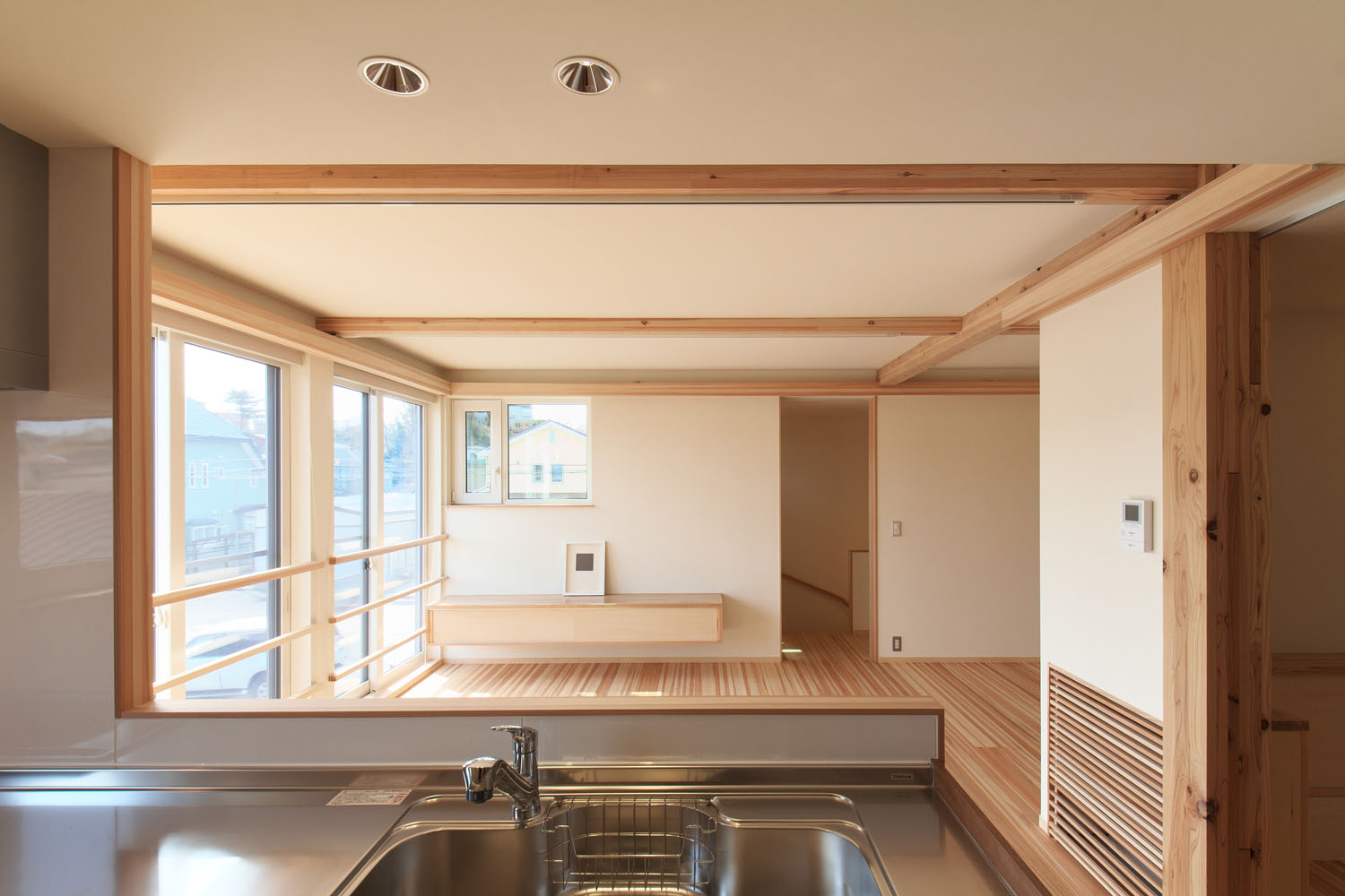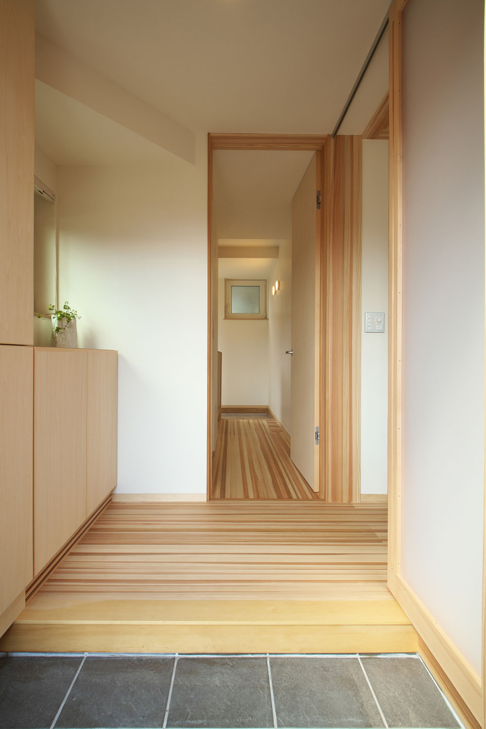 床材はヨシの家のオリジナルである柾目の杉板。杉は空気を多く含むため肌触りが柔らかく、温かい。資源が豊富でコストパフォーマンスにも優れており、傷つきやすい欠点を凌ぐだけの採用理由がある。「気持ちいいので、家に戻るとすぐ裸足になります。夏もサラサラです。前の家ではベタついていたので、素材で違いますね」とSさん。使うほどに暮らしに馴染む自然素材の選定は、愛着を持てる住まいづくりのため。ヨシの家では構造体と設備等が分離されたスケルトン・インフィルの考えのもとに、電気の配線も増設や移動が容易な工夫が取られ、素材だけでなく設備設計も吟味して、末永く暮らせる住まいづくりを心がけている。以前は軒が深く暗かったという室内は、南側の大きな窓からの日差しを塗り壁が拡散し、やわらかい明るさで満たされている。住宅性能も断熱気密を徹底することで、各階ともエアコン1台で全館の室温を調整できるスペックだ。上階の場合、夏はフロア全体に冷房が24時間行き渡った使用状況で過ごし、アパート時代の電気代との差が数百円。新居ではじめて過ごす冬の光熱費への期待が高まっている。