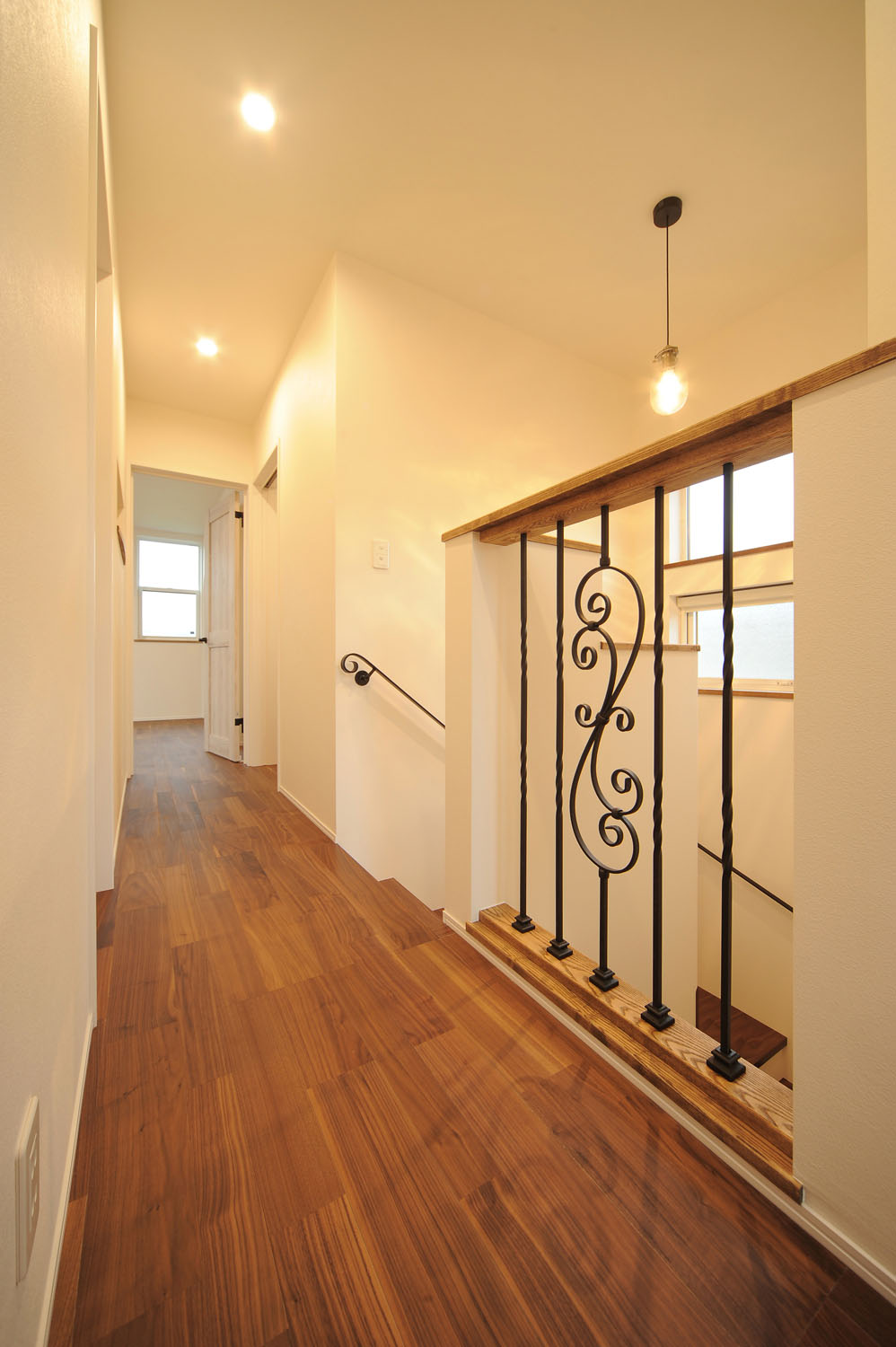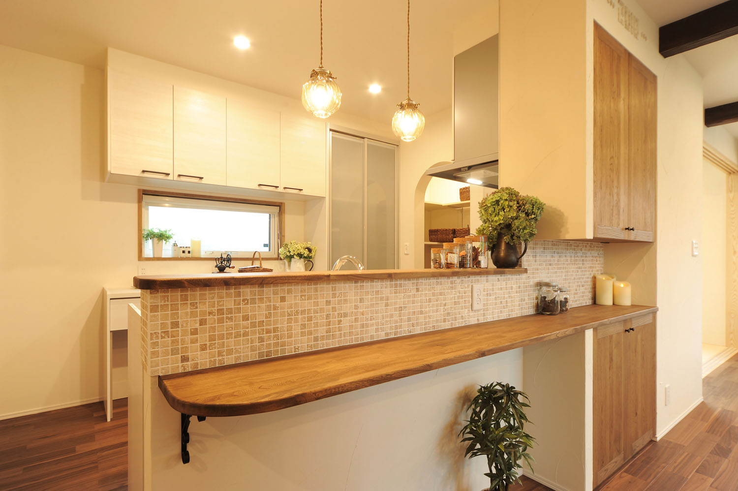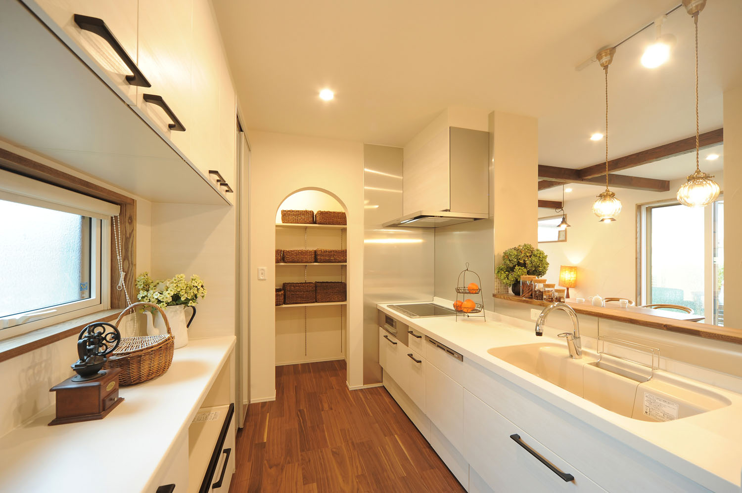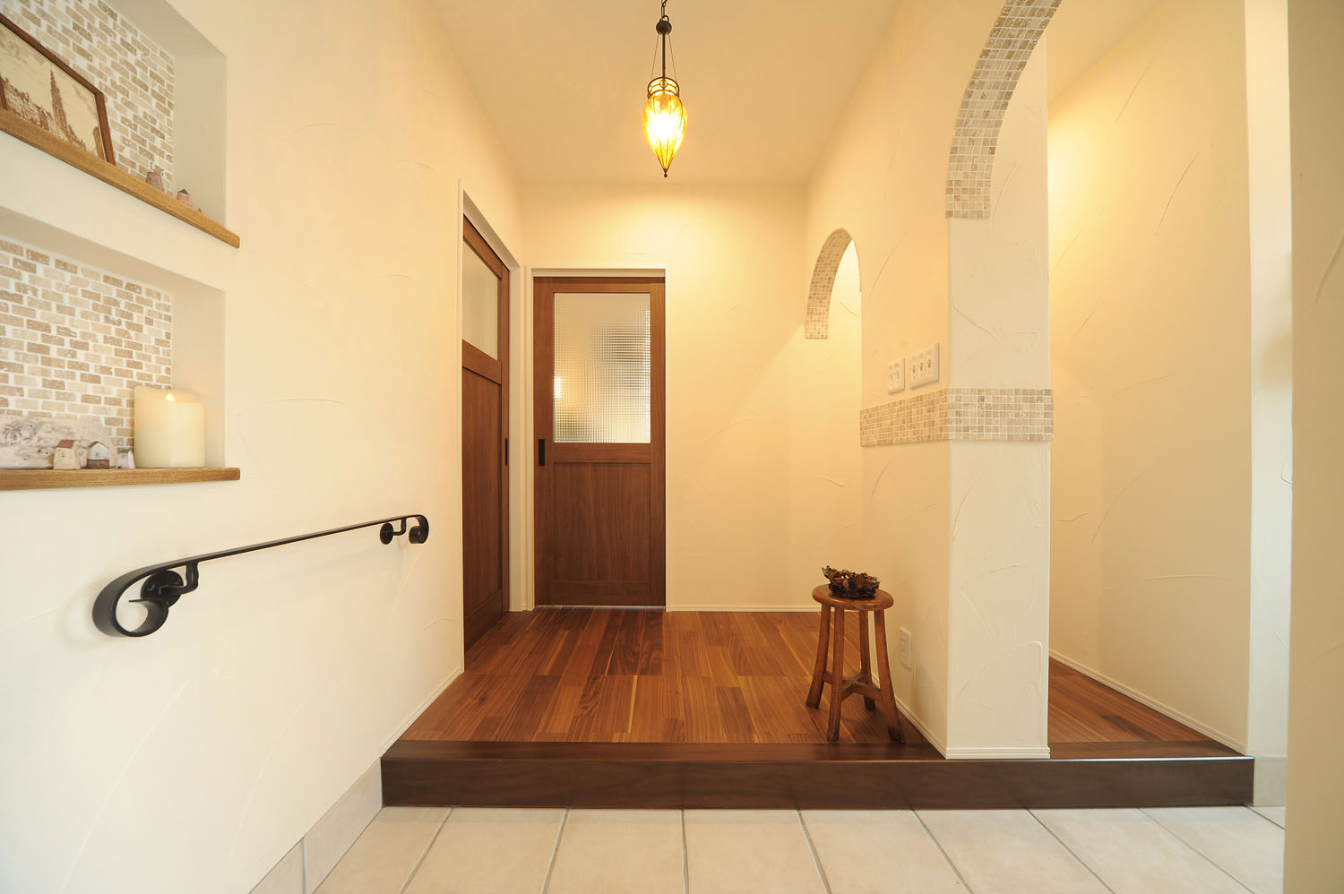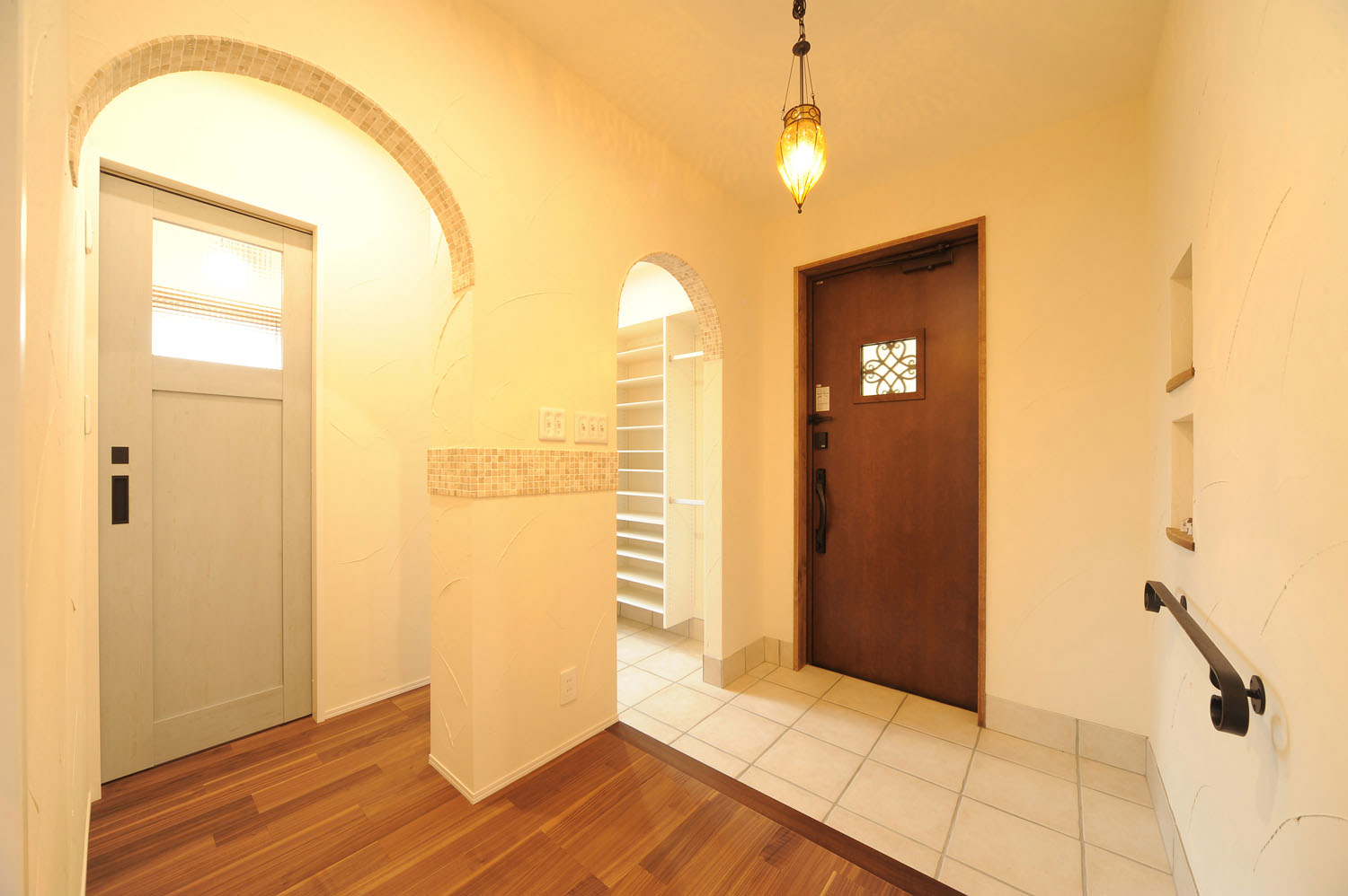 洋瓦による三角屋根の愛らしい外観。この住まいに暮らす施主のKさんが、家づくりを意識し始めたのは3年ほど前。当時から、フレンチカントリーの住まいに憧れ、頭の中に確固とした新居のイメージがあった。敷地の候補として、この閑静な住宅地の角地を探し出し、さらに自分の求めるイメージにぴったりの伊藤建友のアンティークスタイルの家と出会う。そこから住まいづくりはリズム良く進み、夢に見た白亜のイメージと現実的な住みやすさが備わった、Kさんの理想の住まいが完成した。アプローチでまず目に入る広いガレージは、あえてシャッターではなく窓付きの引き戸を採用。陽の光が入る屋根付きの半外空間はDIYや子供の遊び場など多用途で、北国では特に使い勝手の良い空間だ。ガレージと母屋をつなぐポーチから入り口のドアを開けると、6帖もの広い玄関ホールが広がる。シューズクローゼットと家族用玄関がゆったりと取られ、アイアンの手摺りや連なるアーチが、この住まいのこだわりをより強く印象づけている。