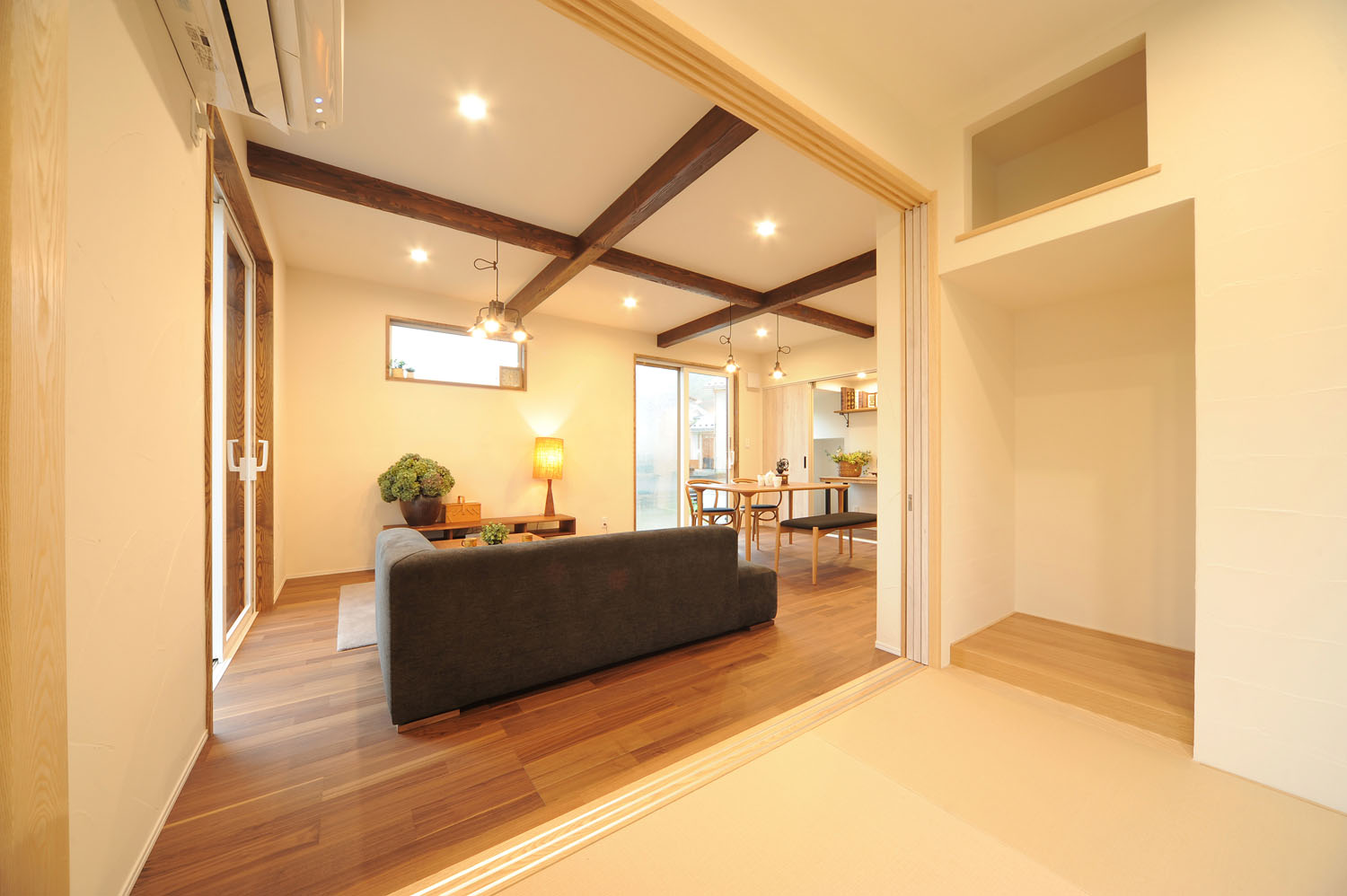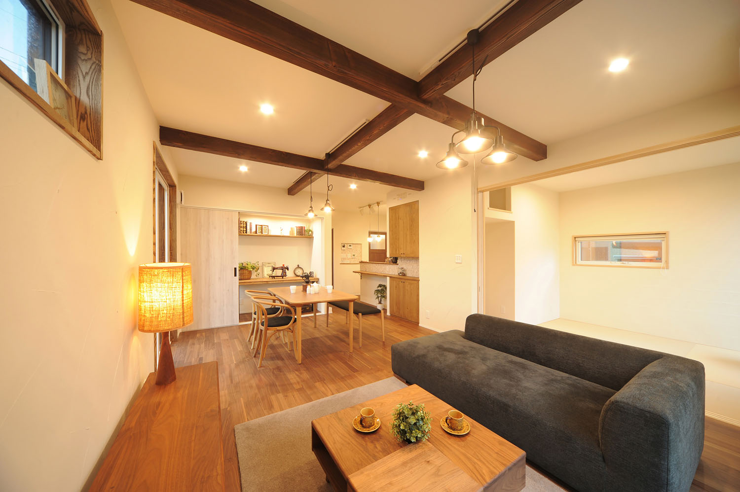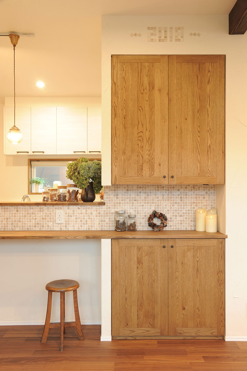 Kさんはフルタイムの仕事に就きながら子育ての真っ最中。仕事と家事と育児で時間に追われる毎日を楽にするため、目指したのは“散らからない”住まいづくり。「以前の賃貸住宅は収納が少なくてとても不便でした。新居は各所に収納スペースを提案してもらい、さらに、片付いて見える“隠せる仕掛け”を加えました」とKさん。例えば階段下スペースを活用した家事机兼収納スペースは、引き戸つきで、学校からのお便りや仕事の書類で机の上が乱雑になっていても、引き戸を閉じるだけで視界から消え、リビングはすっきり。リビングに併設された畳のスペースも、扉を閉じるだけで散乱したおもちゃなどをシャットアウトでき、平静の時間をつくることを可能にしています。家事や育児のストレスの多くは「○○しなくては」という強迫観念が引き起こすもの。「片付けなくちゃ」を減らすことで、育児にも余裕が生まれます。その他にも目につかないところで洗濯物が干せる広い洗面脱衣スペースや、容量を多めに取ったパントリーなど、生活感を生むモノたちを見えない場所に置くことで、くつろげる時間が、日々を穏やかで楽しく変える。
