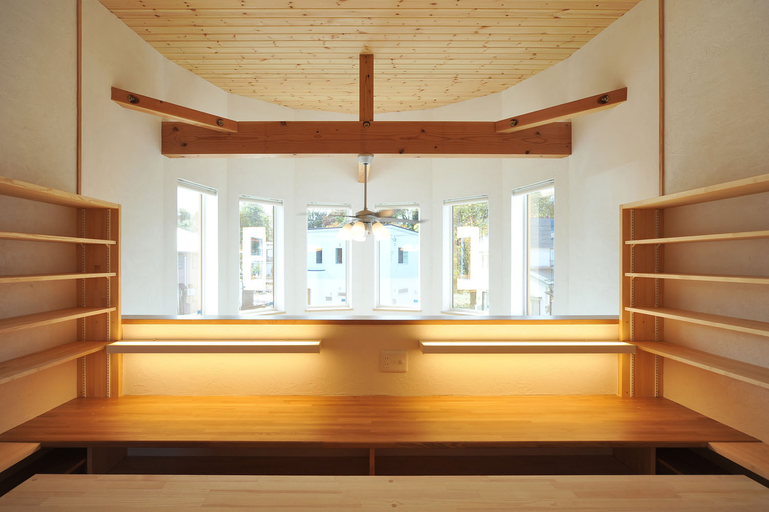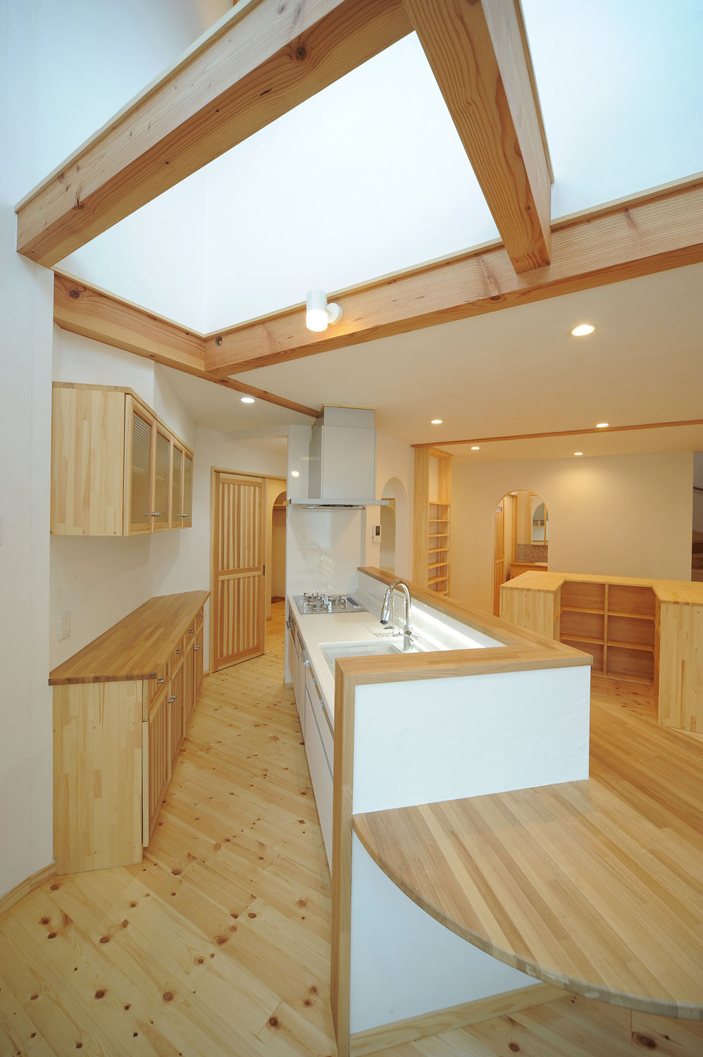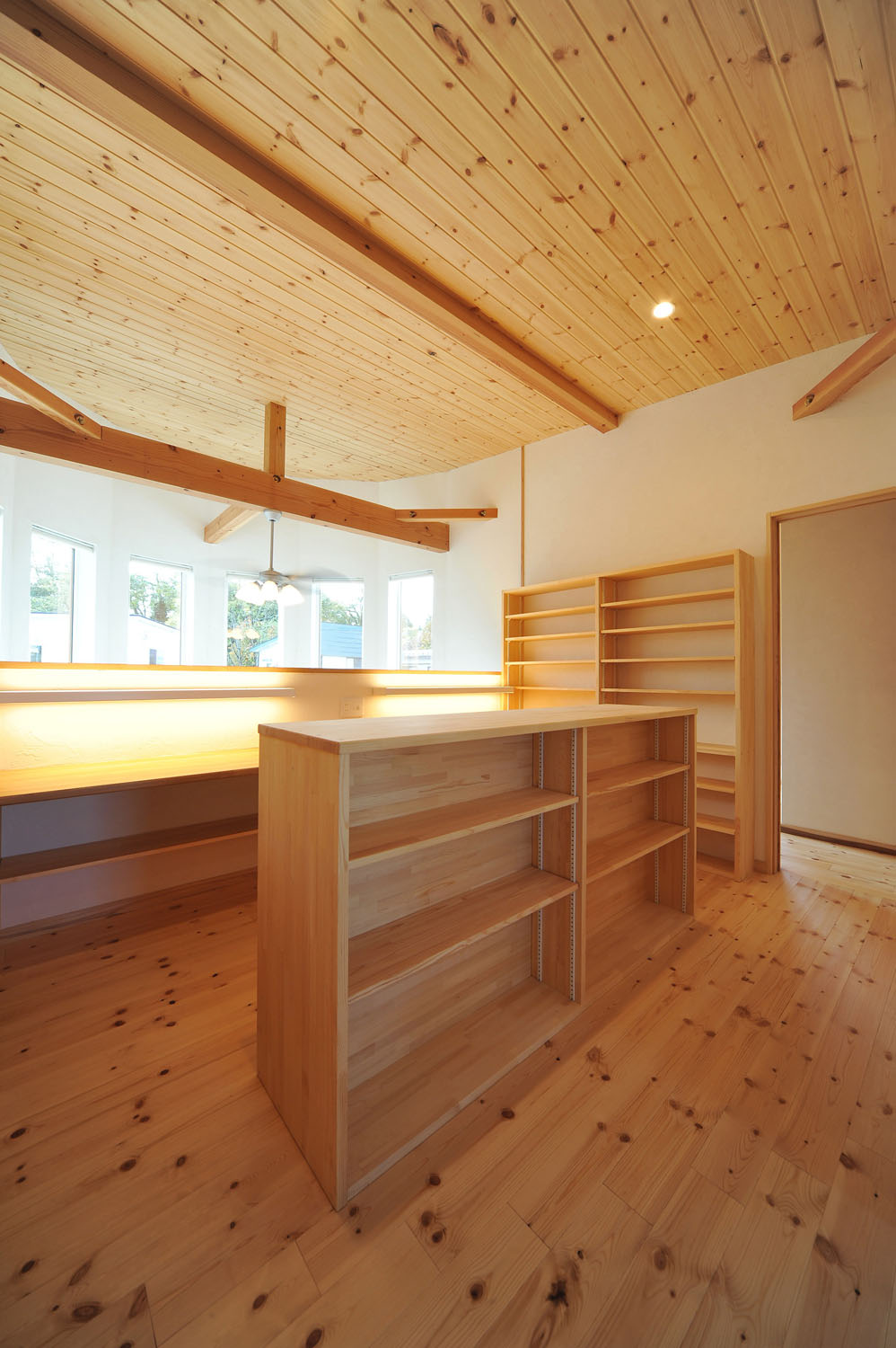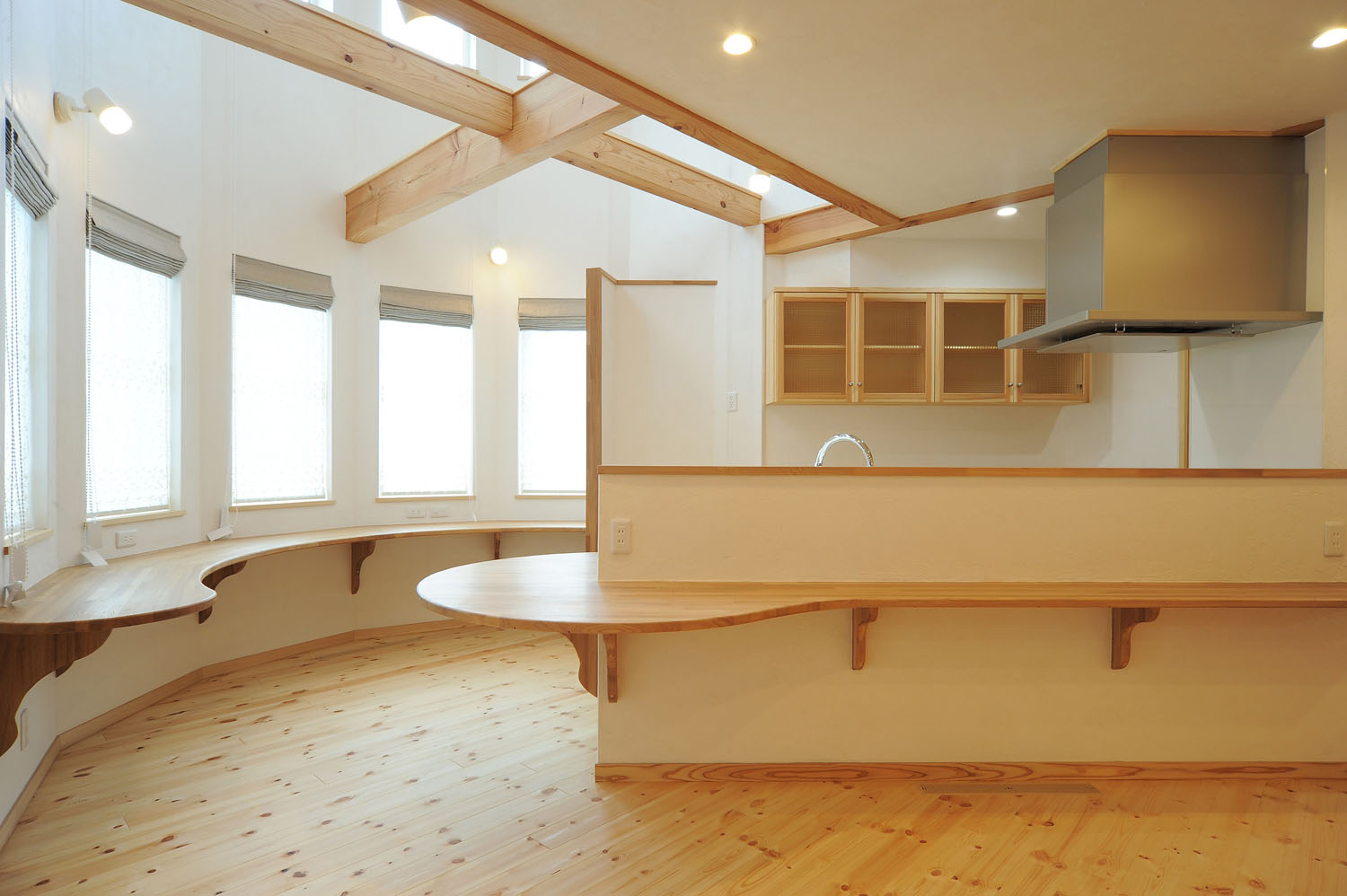 要望に合わせて築いていく、その家族オリジナルの住み心地が、注文住宅の醍醐味。一つひとつの空間が、住み手の希望を叶える職人の手仕事の集合体である手づくりの家は、設計から施工までに時間を要する。たくさんの職人が手がけ、ゆっくりと熟成するように完成した家は、だからこそ家族の「たからもの」となる。施主のKさん夫妻が、新居に求めたオリジナルは、所有するたくさんの本と共存できる暮らし方。親子ともに、どこにいても本を手に取れるよう、手の届く高さのコの字型の本棚がリビングにも設置された。まるで図書館のような空間で、コンサバトリーの壁に沿ったアールのカウンターが、子どもたちの勉強机に。本棚やキッチンの食器収納など、家中の家具がオーダー製作によるこの家のための一点物だ。掃除がしやすいように、という要望にあわせて、飽きのこないシンプルな形状で統一されている。ご主人の故郷へUターンするKさん一家のために築かれたこの北国の新居が、明るく暖かく、家族の静かな時間を守り続けていく。