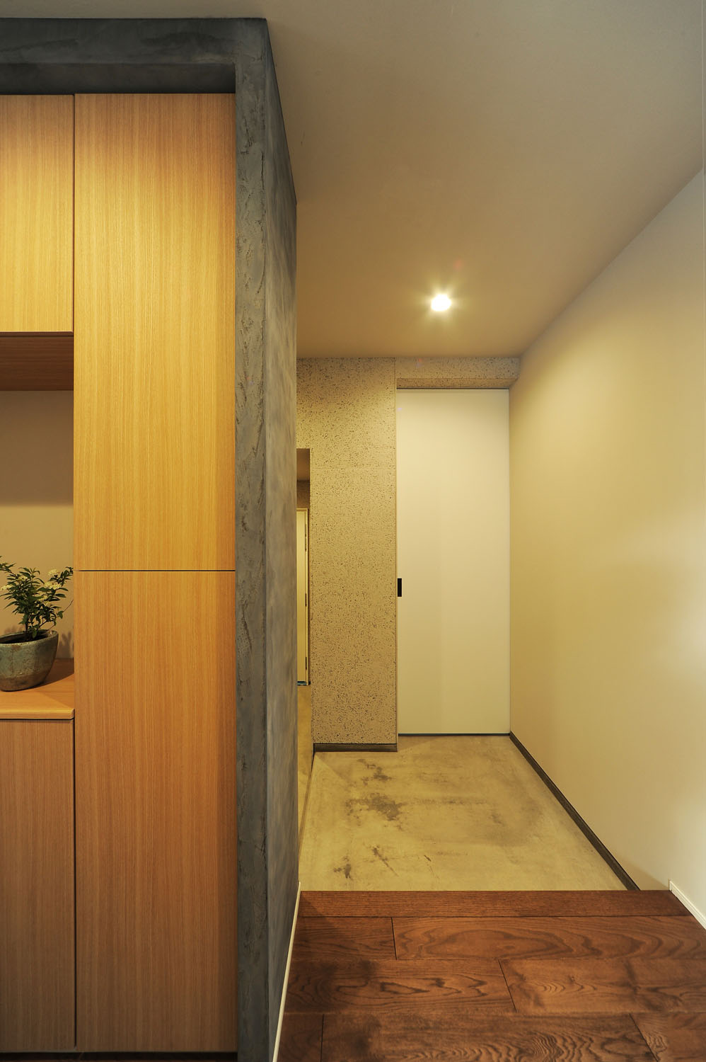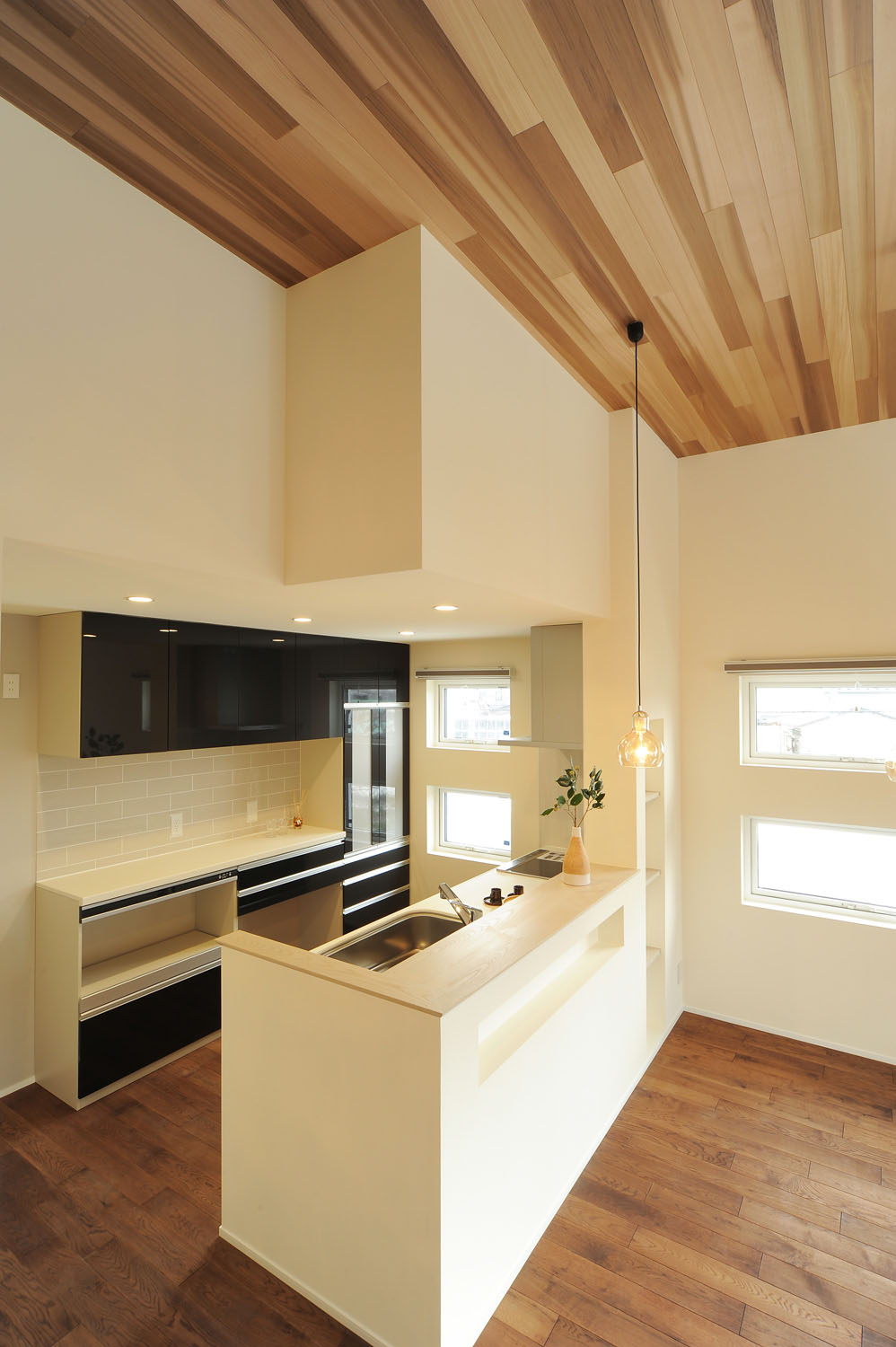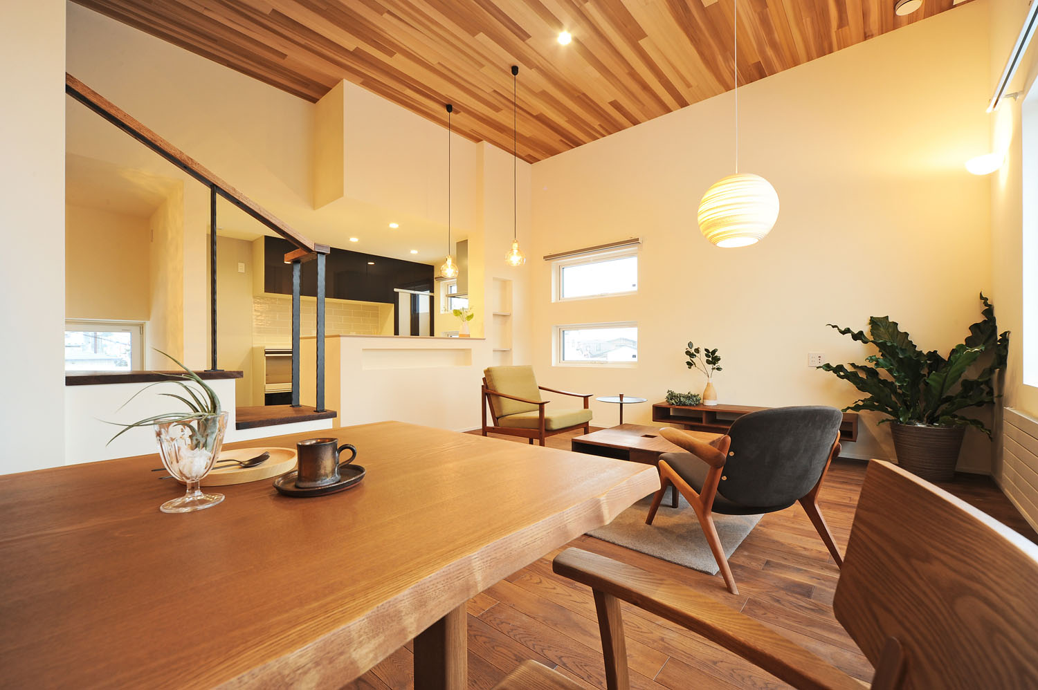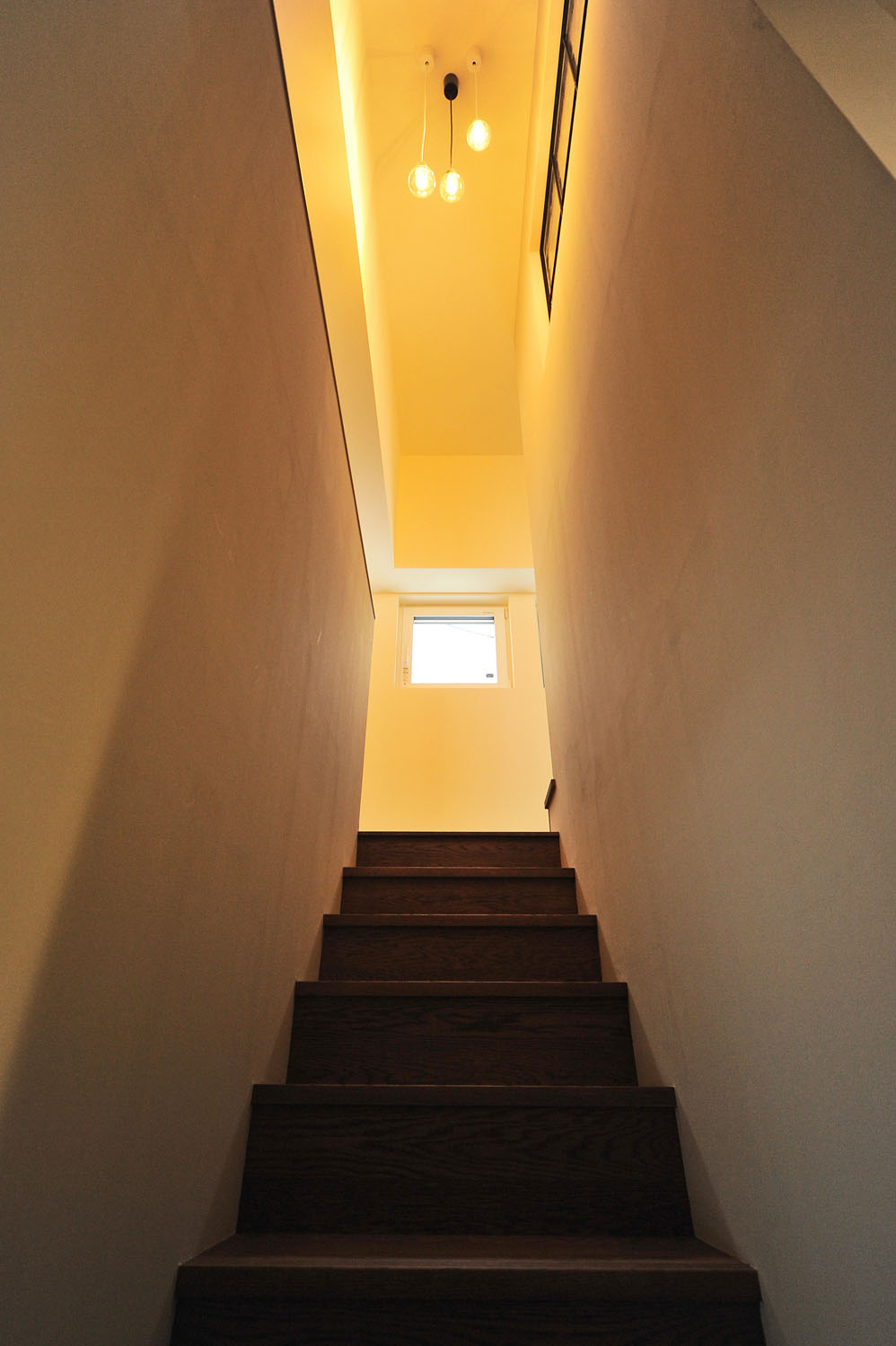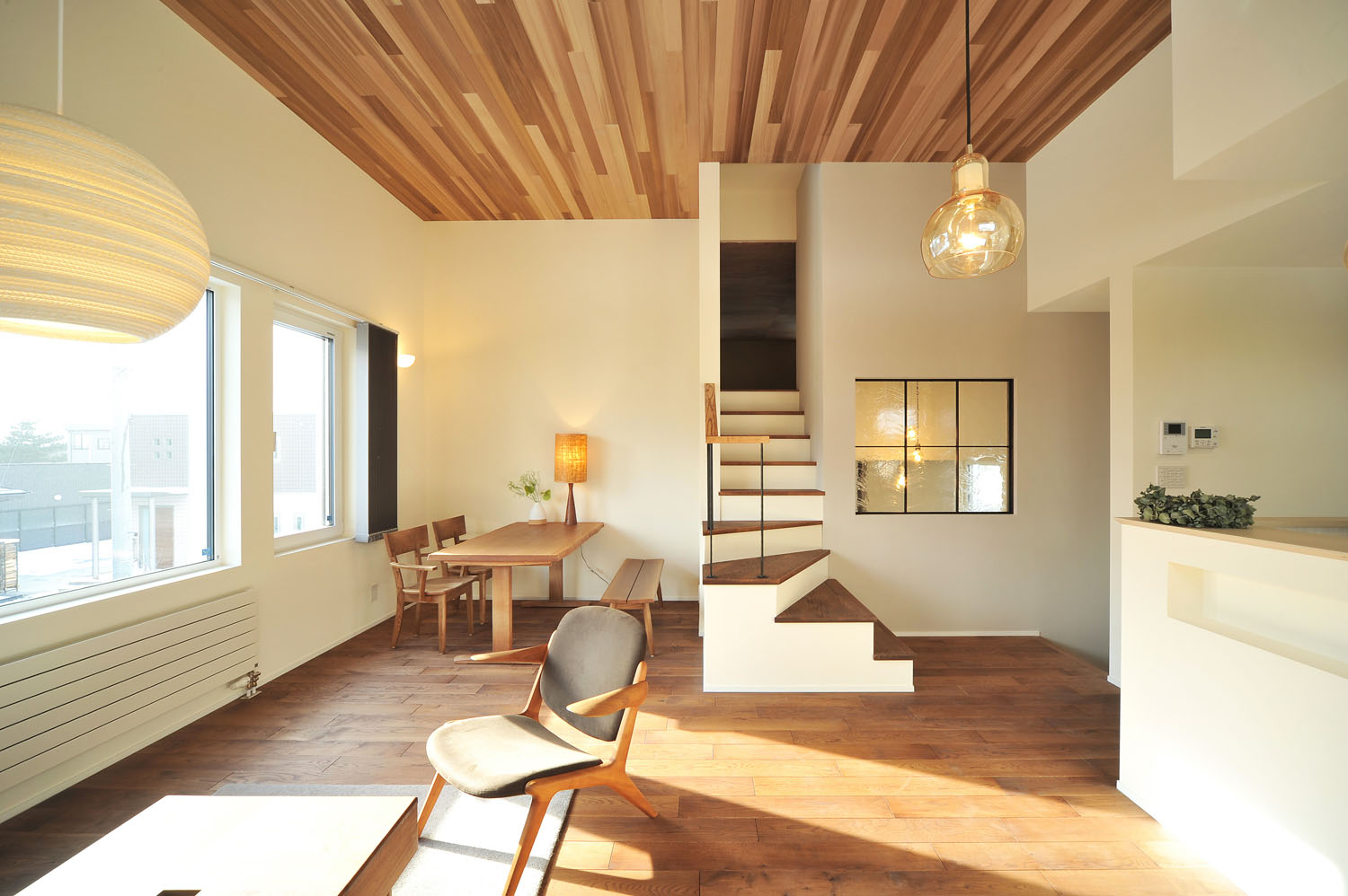 眺めの良いLDKは、レッドシダー張りの高い天井、深い色味のナラ材の床、白いペイント壁。窓からたっぷりと陽が注ぐ日中は開放感、夜は心の休まる寛ぎ感と、ふたつの表情を合わせ持つ“癒し”のためのフロアだ。照度を抑え、高低差をつけて灯りを点在させることで、表情がガラリと変わり、気持ちのオンとオフに効果的に作用する。他の各階も目的ごとに分けられ、店舗と通じた1層目には、仕事の合間に洗濯ができるよう浴室と洗面脱衣室を配置。南向きの物干し室もある“洗う”ためのフロアだ。2層目は主寝室と子ども室が並ぶ“眠る”フロア。そして、3層目にあるリビング階段からアクセスする4層目は、衣類やアウトドア道具など何でも“仕舞う”、階高1.4mの小屋裏を利用した大容量のファミリークローゼットのフロア。住宅を得意とする一級建築士の大胆な設計と、多層に渡る階段の収め方から断熱気密施工まで、表には出ない細やかな職人の手仕事。現代の工務店が得意とする2つの合わせ技が、S邸の暮らしのデザインと性能を支えている。