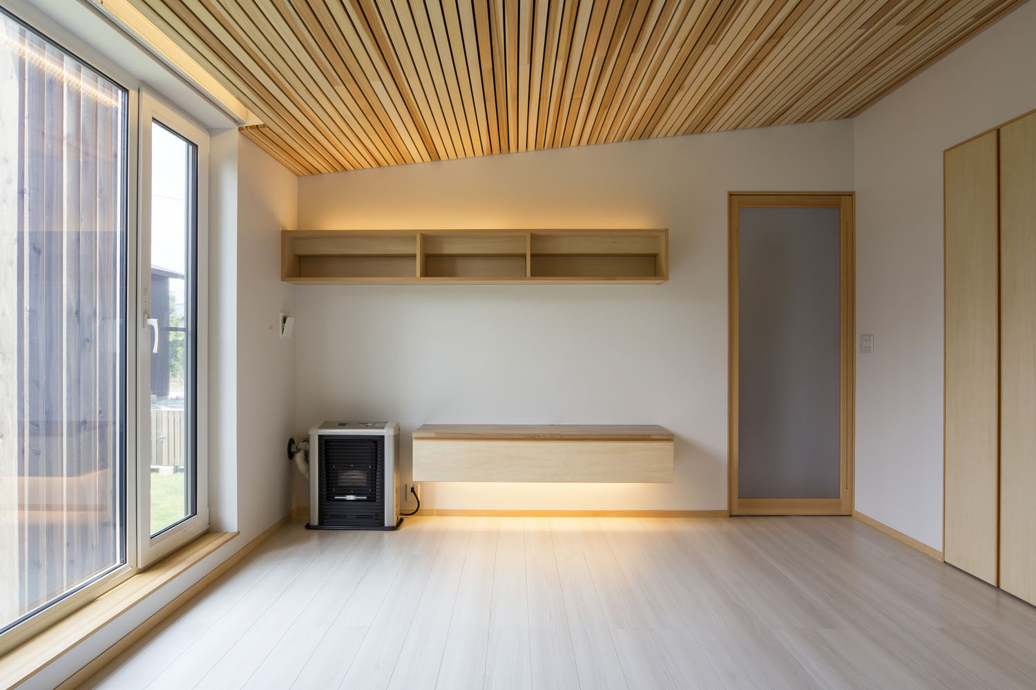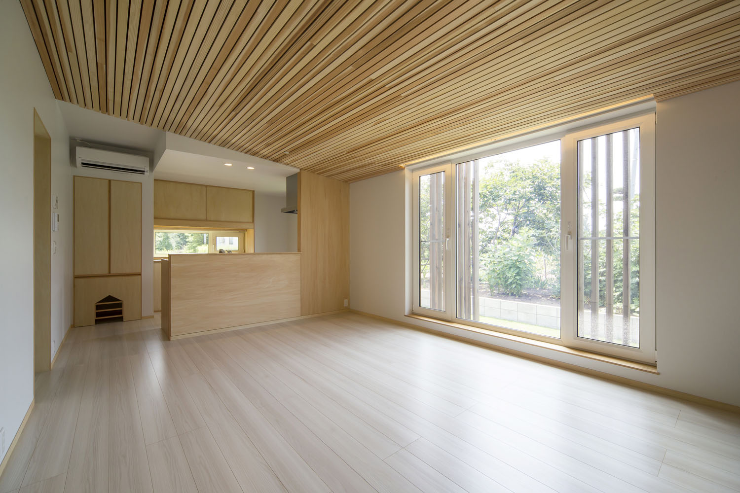 25坪というコンパクトな坪数を微塵も感じさせない、この伸びやかな住空間には、三世代の大人3人と愛犬が暮らしている。少子高齢化の進む日本において、動物と共にある感性豊かな暮らしを求める人は増加傾向で、同時に一方的に可愛がる愛玩動物から、家族と共に生活する頼れるパートナーとして、その存在の重みも変化してきた。この住まいは、愛犬の息抜きと人の安らぎのための芝生の庭や、愛犬の安全と安心のための造作工事、体感温度の違いを埋めるために個室ごとに設けた冷暖房設備など、犬も人も、一緒に暮らす者同士が、良い関係で助け合うために必要な仕掛けが、建築によって施されている。「ペットを飼う」のではなく、「ペットと暮らす」ことに主眼を置いた、人と犬のための共生住宅だ。