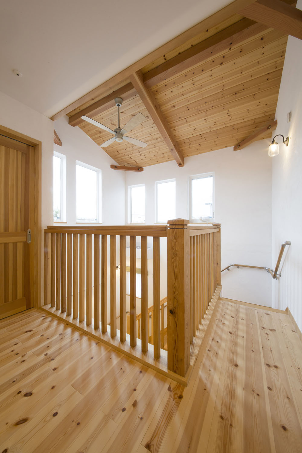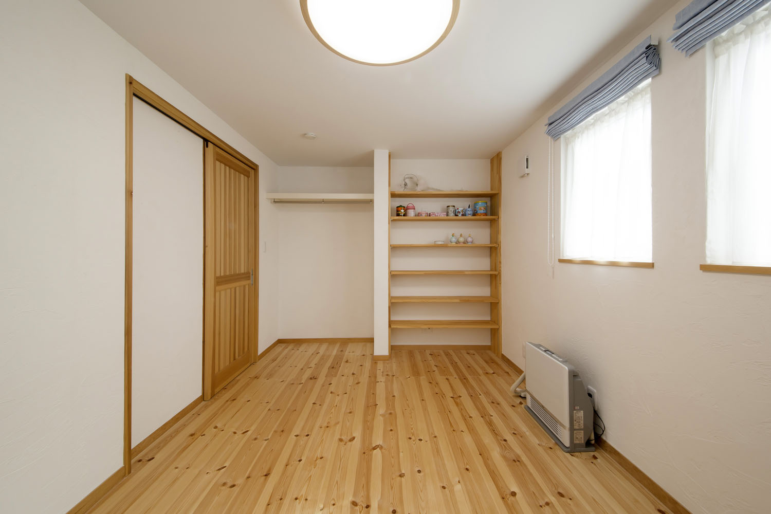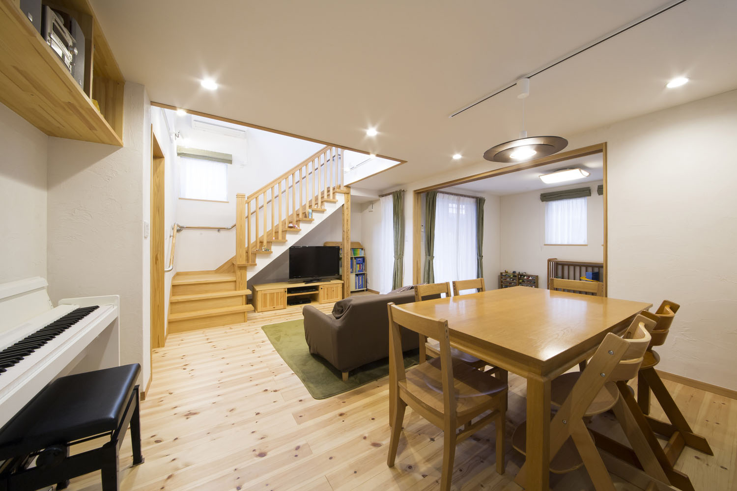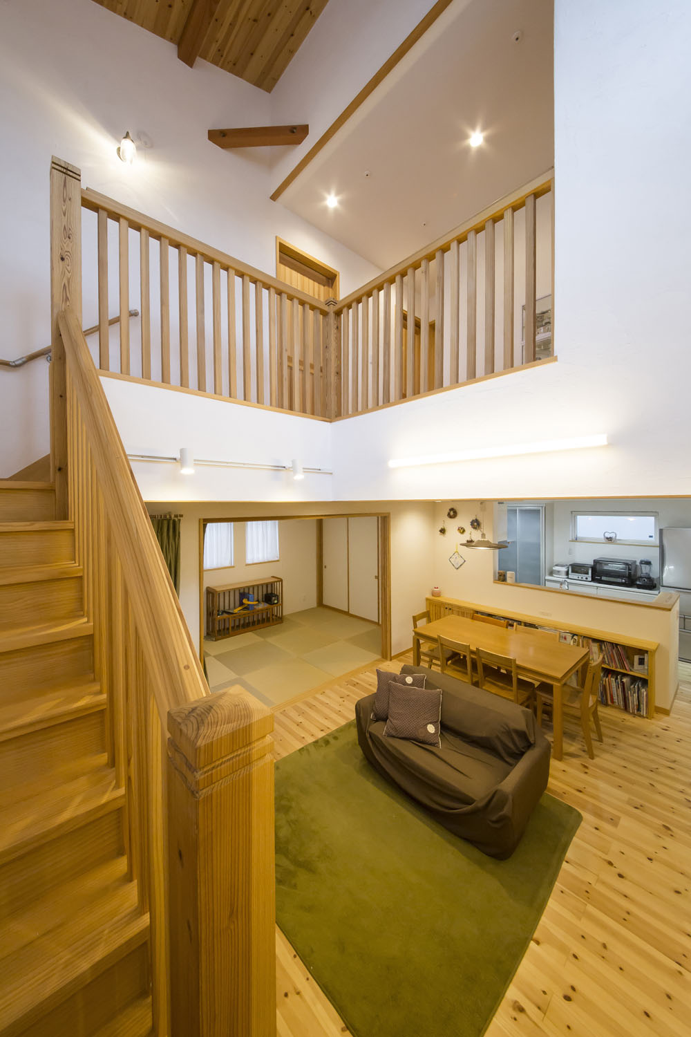 走り回る子どもたちを叱ることなく、自由に遊ばせたい。そんな思いから、近隣に迷惑のかからない環境が、家づくりの第一目的だったというTさん夫妻。夫婦揃って無垢材の住空間を望んでいたため、5社ほどの候補のうち、見学会の際に肌で感じた空気感と、木の香りが印象的だった村岡組デザインに依頼を決めた。完成した新居の室内には、その時と同じ、木の心地良い香りが漂っている。そしてとても静かだ。この静穏さは、躯体の断熱性能はもちろんのこと、窓計画が果たす役割が大きいように感じる。T邸では、あえて南面に吹き抜けの階段ホールを配置し、2階の窓からリビングへ明るさを届ける設計。ガラス面は音の反射が大きいため、リビングの低い位置にないことで、子どもたちの歓喜の声も反響しにくい。また、体感場所に直接的な日差しが注がず、さらに遮熱ガラスで熱が入り込みにくいため、エアコンを必要とする日数もグンと減り、冷房の効きが良い。わずか15帖分程度のエアコン1台で全館の冷房を可能とし、真夏でも電気代は1万円を切るという家計に優しいパフォーマンスだ。