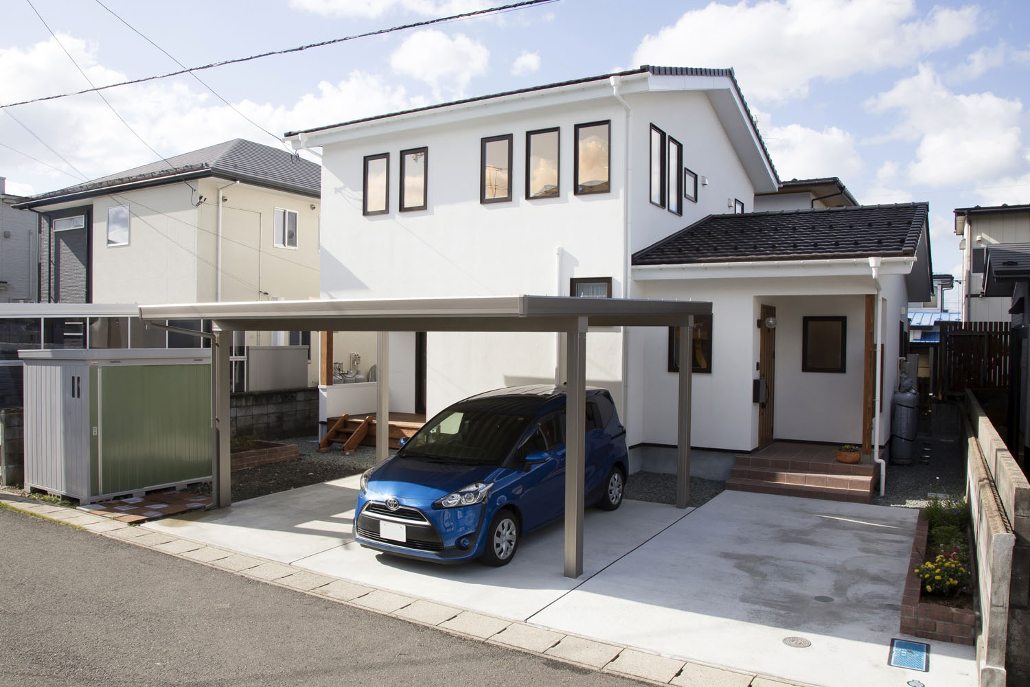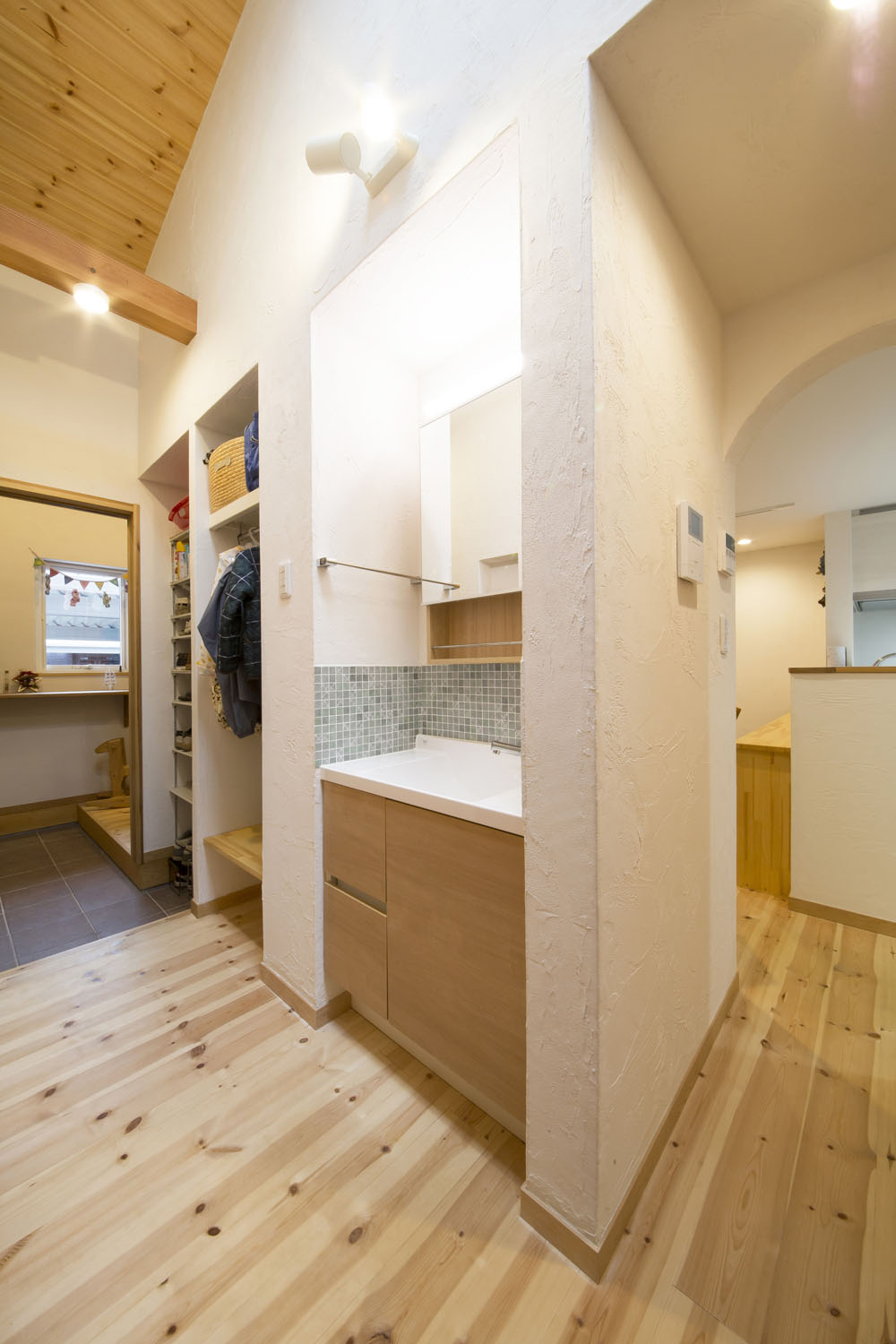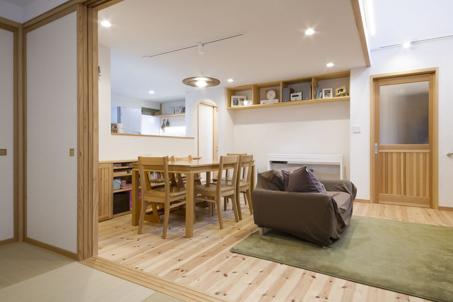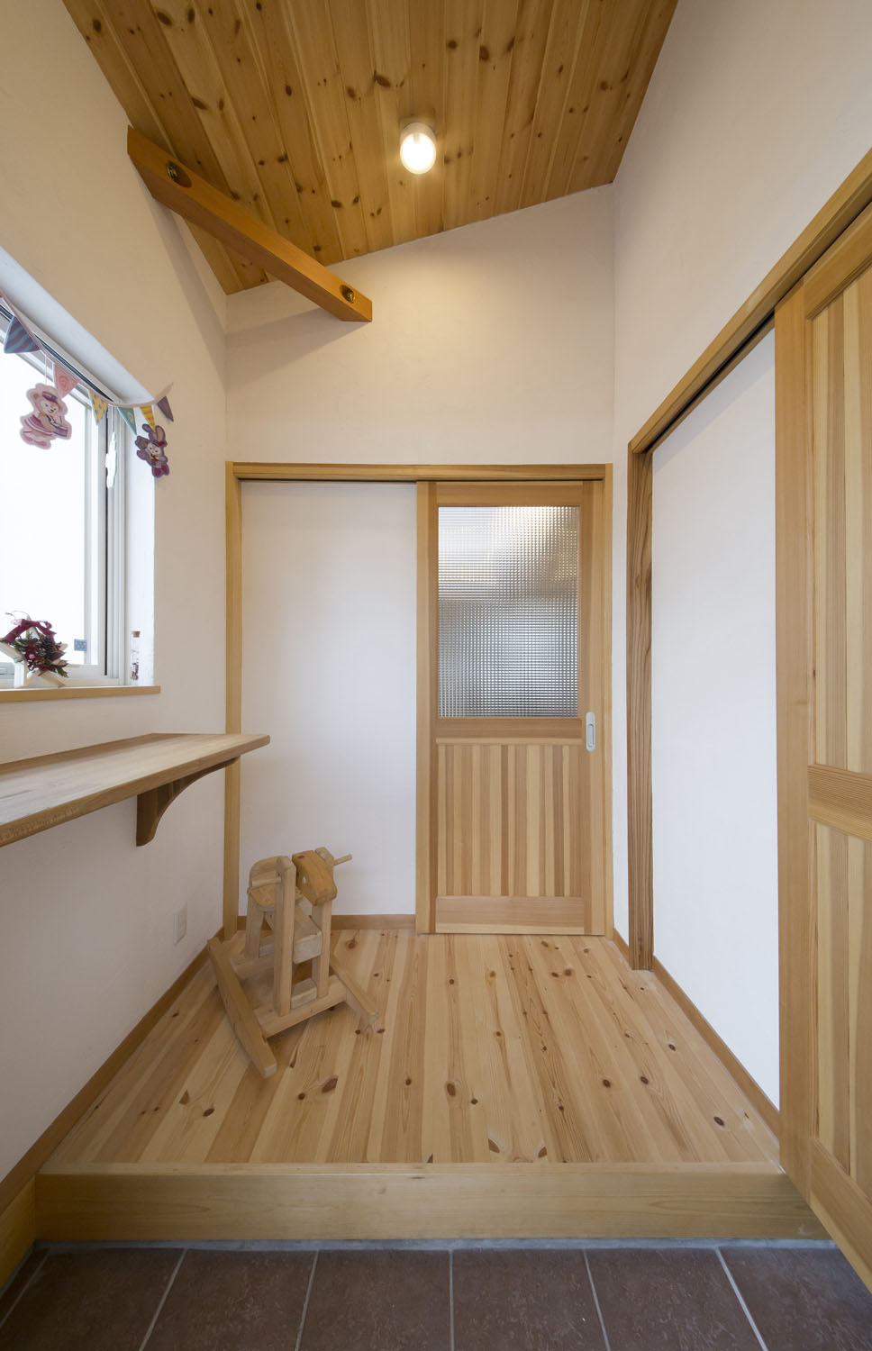 走り回る子どもたちを叱ることなく、自由に遊ばせたい。そんな思いから、近隣に迷惑のかからない環境が、家づくりの第一目的だったというTさん夫妻。夫婦揃って無垢材の住空間を望んでいたため、5社ほどの候補のうち、見学会の際に肌で感じた空気感と、木の香りが印象的だった村岡組デザインに依頼を決めた。完成した新居の室内には、その時と同じ、木の心地良い香りが漂っている。そしてとても静かだ。この静穏さは、躯体の断熱性能はもちろんのこと、窓計画が果たす役割が大きいように感じる。T邸では、あえて南面に吹き抜けの階段ホールを配置し、2階の窓からリビングへ明るさを届ける設計。ガラス面は音の反射が大きいため、リビングの低い位置にないことで、子どもたちの歓喜の声も反響しにくい。また、体感場所に直接的な日差しが注がず、さらに遮熱ガラスで熱が入り込みにくいため、エアコンを必要とする日数もグンと減り、冷房の効きが良い。わずか15帖分程度のエアコン1台で全館の冷房を可能とし、真夏でも電気代は1万円を切るという家計に優しいパフォーマンスだ。