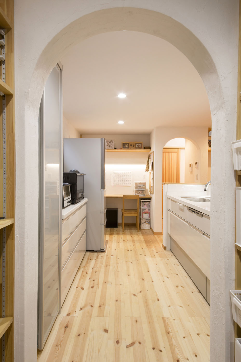 建築物の平面図から立体の姿を想像できず、苦労する経験は誰しも経験があるだろう。棚のピッチやキッチンの手元を隠すカウンターの高さには、実際に使う人が、その空間に身を置かないと得られないサイズ感が、確かに存在する。村岡組デザインでは、現場合わせが可能な造作に関して、できるだけ図面で固定しないよう心がけている。作り込みの前に現場へ足を運んでもらい、実物を目で見た施主の感覚で、細部を最終決定していく。紙の上での取り決めよりも手間はかかるが、「想像と違った」「こうすれば良かった」というマイナスの気持ちを、住まいに残さないための配慮だ。T邸も当初は階段下に収納棚が入る予定だった。サイズを決めるために現場を訪れ、収納で閉じてしまうことがもったいないように感じ、開放して使える形に変更。想像と実物のすり合わせは、耐久財である住まいづくりにおいて、暮らしの質に直結する大問題だ。自分の目で見て決められる余白を残した設計が、妥協のない満足感をつくり出している。